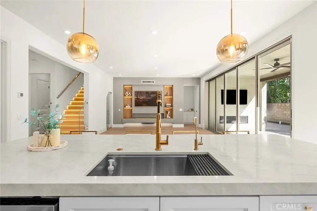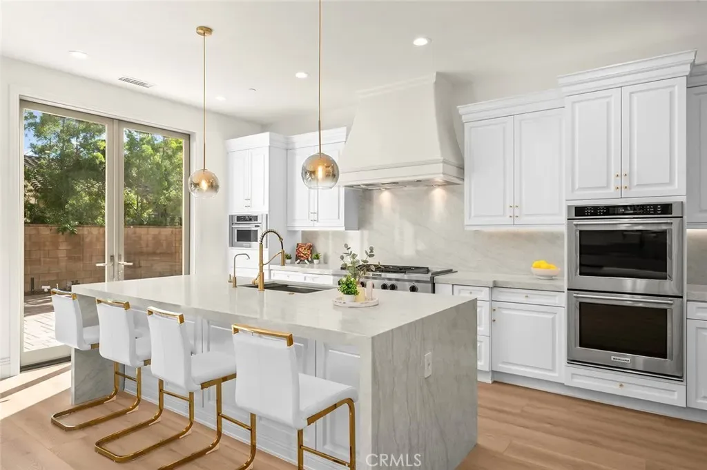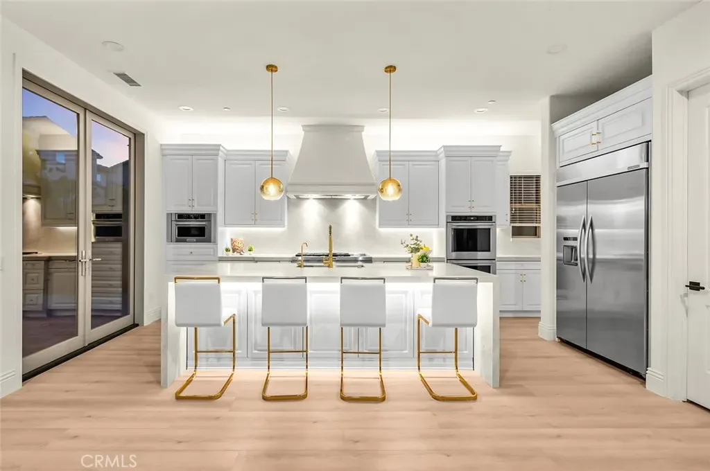 Fully reimagined, design-forward home just under 4,000 sq ft on one of the most desirable streets in Tustin Legacy. This turnkey, model-like residence features a dramatic skylit entry with soaring ceilings and an open-concept layout filled with natural light. It is upgraded throughout with wide-plank luxury flooring, designer lighting, and modern finishes. The chef’s kitchen showcases Taj Mahal countertops with waterfall edges, custom cabinetry, and premium stainless steel Kitchen-Aid appliances. A custom double-door system creates seamless indoor-outdoor flow, ideal for entertaining. Highlights include a custom wine & tequila room and a striking LED-lit staircase with glass railings. The primary suite offers a spa-inspired bath and a large walk-in closet. Secondary bedrooms provide flexibility for guests or office use. Private outdoor space designed for entertaining and relaxation. Located in the highly sought-after Tustin Legacy community near top-rated schools, parks, pickleball courts, shopping, and dining. Rare opportunity on a premier street.
