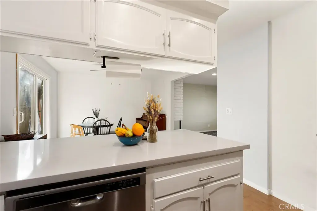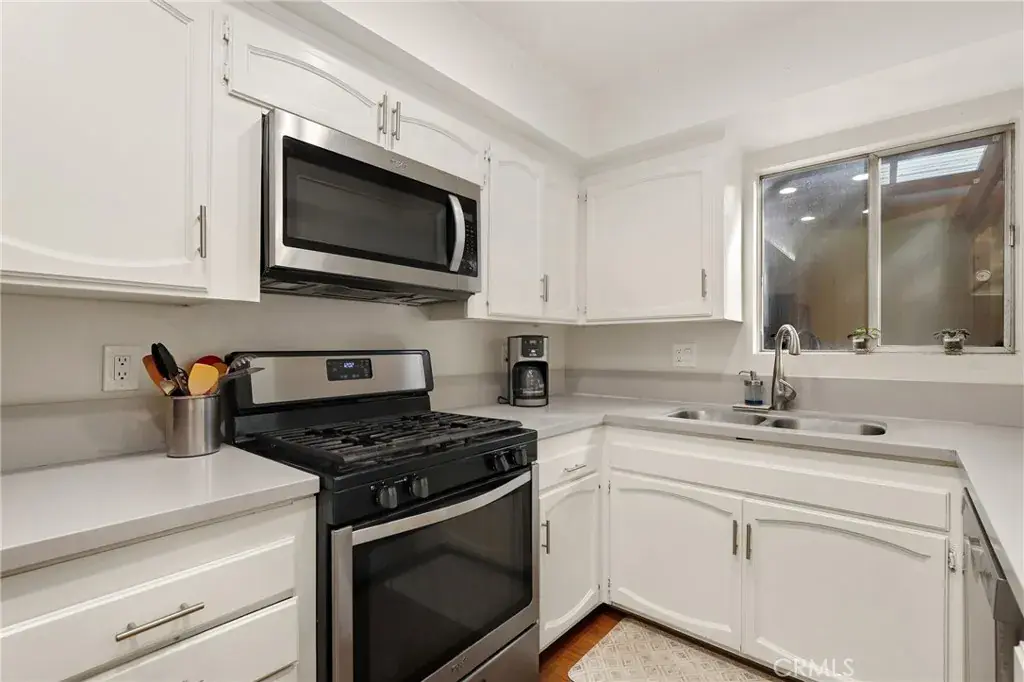 Welcome to 13652 Red Hill Ave, Apt C, located in the desirable gated Tustin Villas community. This inviting home features wood-like tile flooring and recessed lighting throughout the main living area. The living room offers a cozy brick fireplace and flows seamlessly into the dining area and upgraded kitchen, complete with white cabinetry, quartz countertops, and stainless steel appliances. Sliding glass doors open to a permitted private rear patio with a covered pergola, providing an ideal space for outdoor entertaining, along with a convenient laundry area and direct access to the two-car garage. A powder room completes the first level.