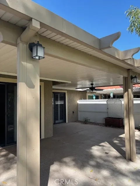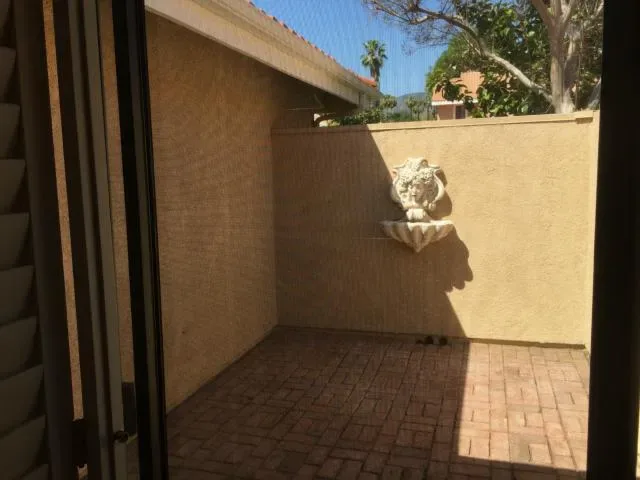 Quiet location yet steps away from pool/spa area, tennis/pickleball courts and picnic area! This home has great potential for new buyer!! Master bedroom offers walk in closet and access to rear Alumawood covered patio (with recessed lighting and patio fan) with beautiful golf course views. Fireplace and crown molding in living room and formal dining room. Kitchen has a cheerful garden window and granite counters Front bedroom features its own private courtyard, walk in closet and built in bookcases! Additional amenities are indoor laundry, wired for security system, plantation shutters throughout and many more extras.