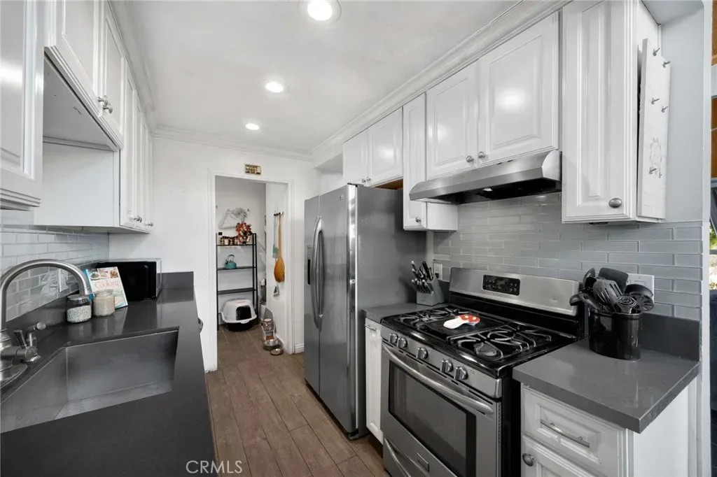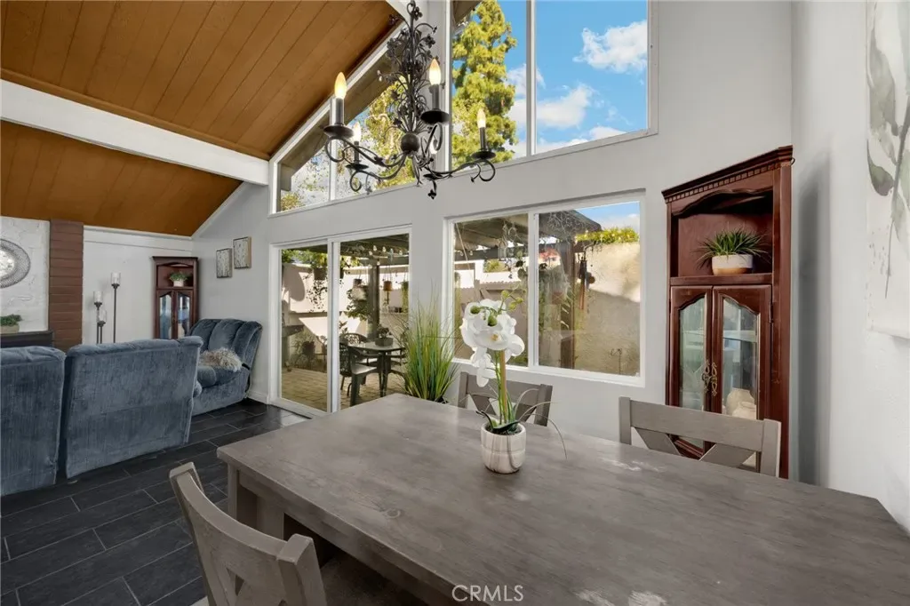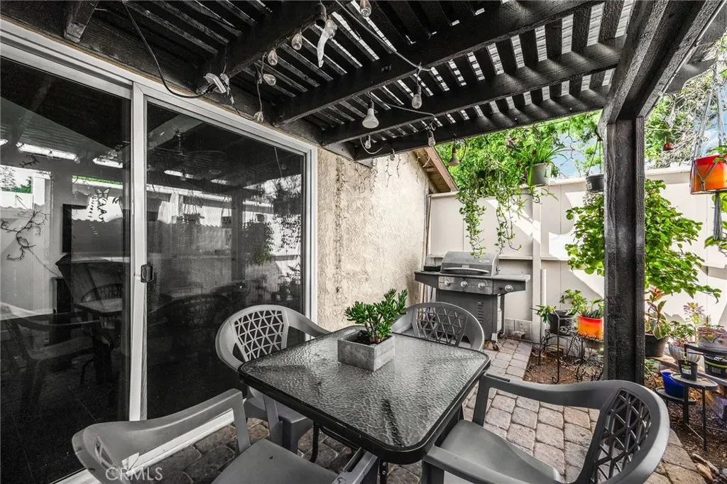 Beautiful updated condo featuring vaulted ceilings, a fireplace, new windows and 8 month old A/C condenser unit and coils for year round comfort. Inside you will find stylish black tile flooring, a bright white kitchen with stainless steel appliances, and quartz style countertops. Two separate sink areas and a stone walk in shower complete the main bath area. Additional sink/dressing area located off of the primary has new tile floors and quartz style counters. A functional layout that feels both modern and inviting. This home also includes a full size laundry room with additional cabinet space. Enjoy outdoor living with your own private patio, plus the benefit of a one-car garage. Ideally located just a few steps from the community pool, making it easy to relax and enjoy the amenities. Located close to freeways, shopping, and restaurants.