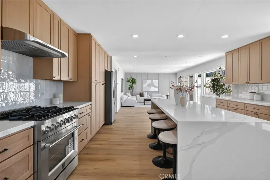 Inside, earth-toned finishes and warm tans create a nature-inspired palette throughout. The oversized kitchen is a chef’s delight with white oak shaker cabinets, elegant quartz countertops with subtle color veining, and a perfectly sized island ideal for gathering. New LVP flooring and recessed lighting flow through the home, enhancing brightness and a modern feel.