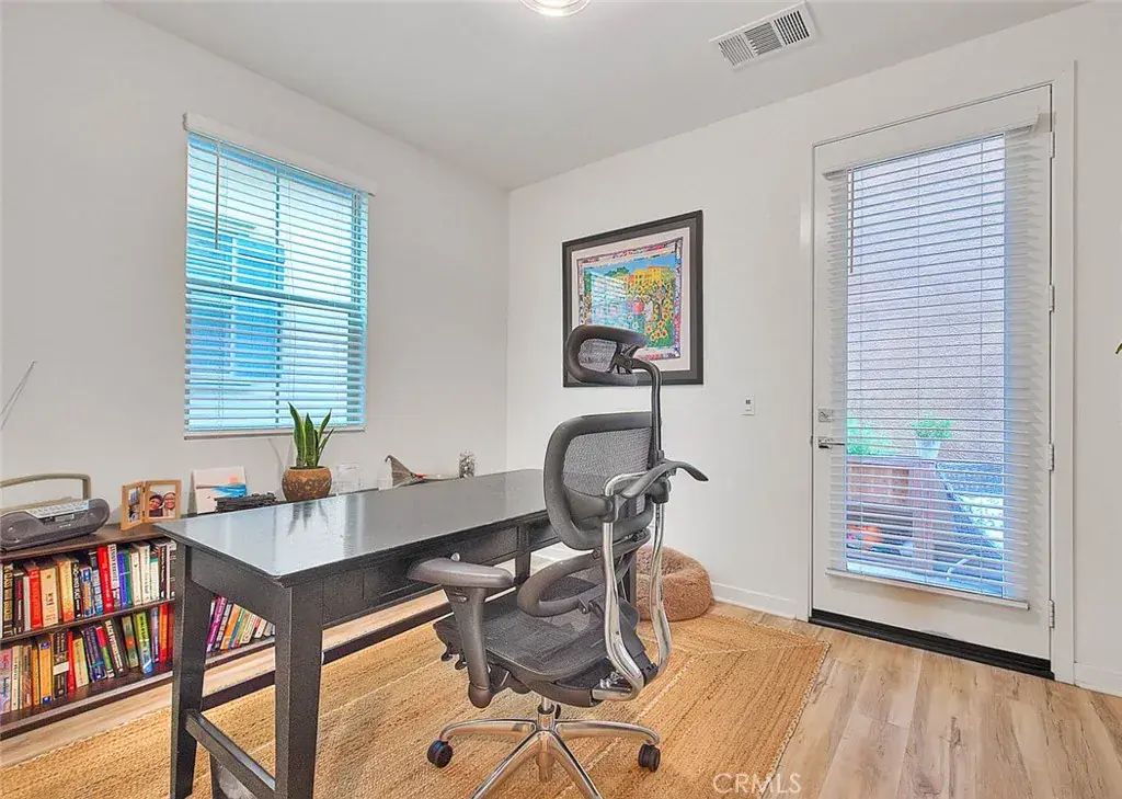 Downstairs on the first floor you will find an office this is on Title as the 3rd bedroom and it has a closet, with a door leading to a small outdoor area, ideal area for a retreat or office or den. Additional highlights include a 2-car attached garage, leased solar system, and a tankless water heater for energy efficiency and modern comfort.