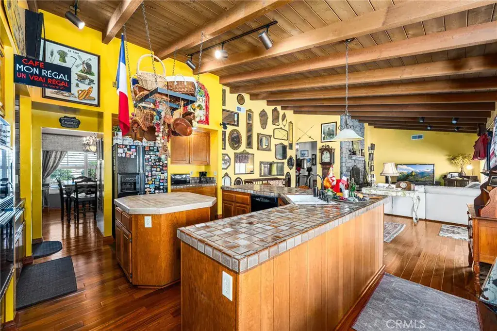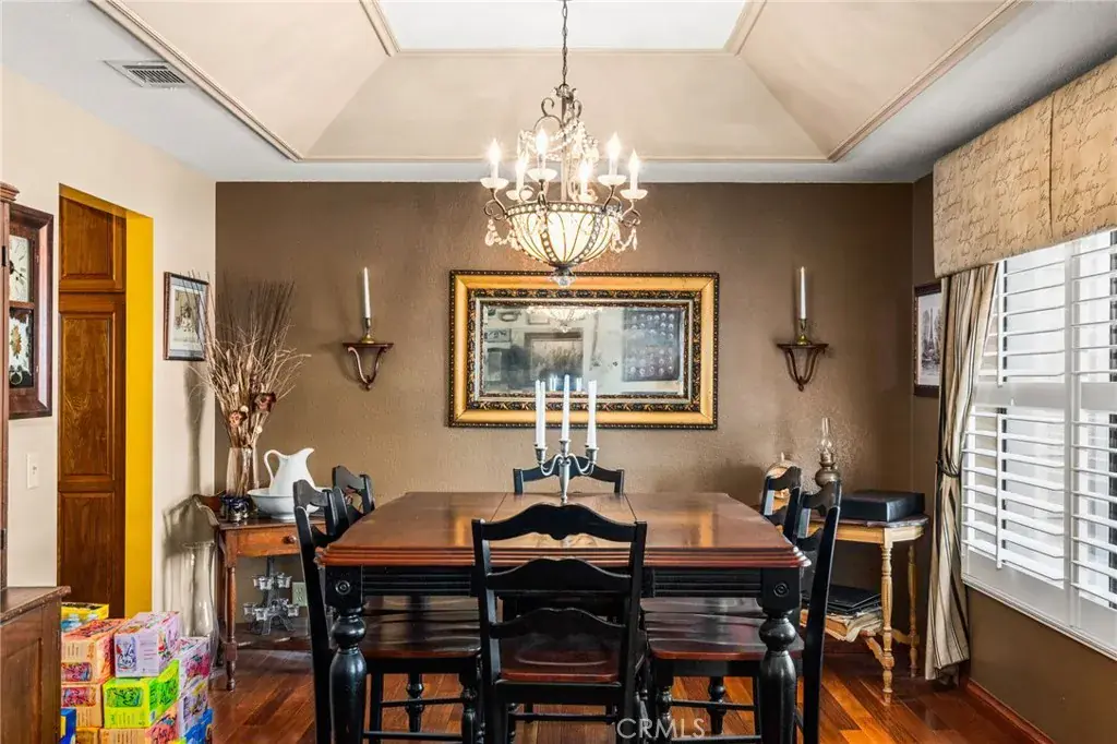 Step through the double-door entry into a home adorned with exquisite hardwood flooring throughout. The formal living room seamlessly flows into a generously sized formal dining room, featuring coffered ceilings that create a space well suited for entertaining friends and family—perfect with the holidays approaching. The dining room provides direct access to the kitchen, a true chef’s delight. This expansive kitchen opens to the family room and includes a breakfast counter bar, a center island, an abundance of cabinetry, and a cozy breakfast nook. The earthy wood beam ceilings and the warmth of the stone fireplace with a raised hearth in the family room make it an inviting space for relaxation.