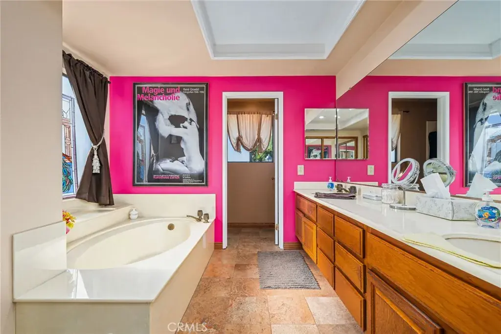 The home features three bedrooms, including a romantic primary en suite. Unwind in the luxurious soaking tub or enjoy the shower. The additional two bedrooms are well-sized, with a secondary bath offering double sinks and a tub-over-shower.