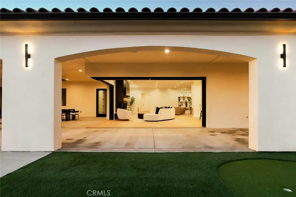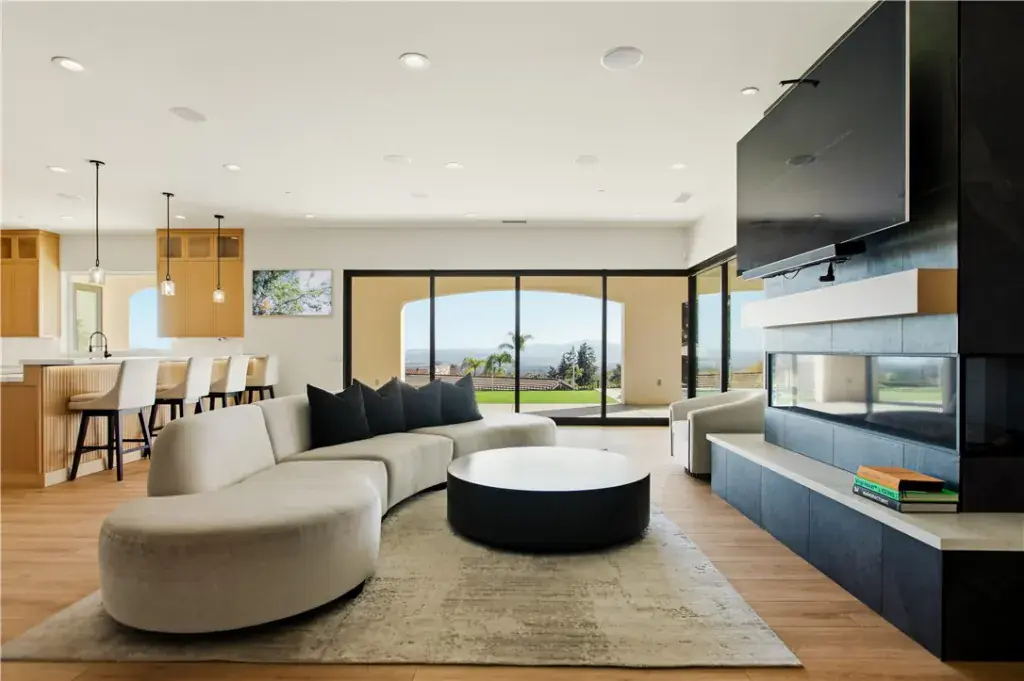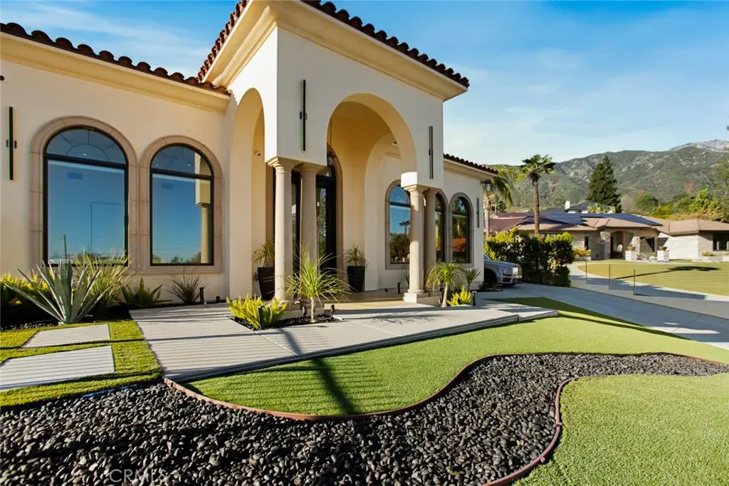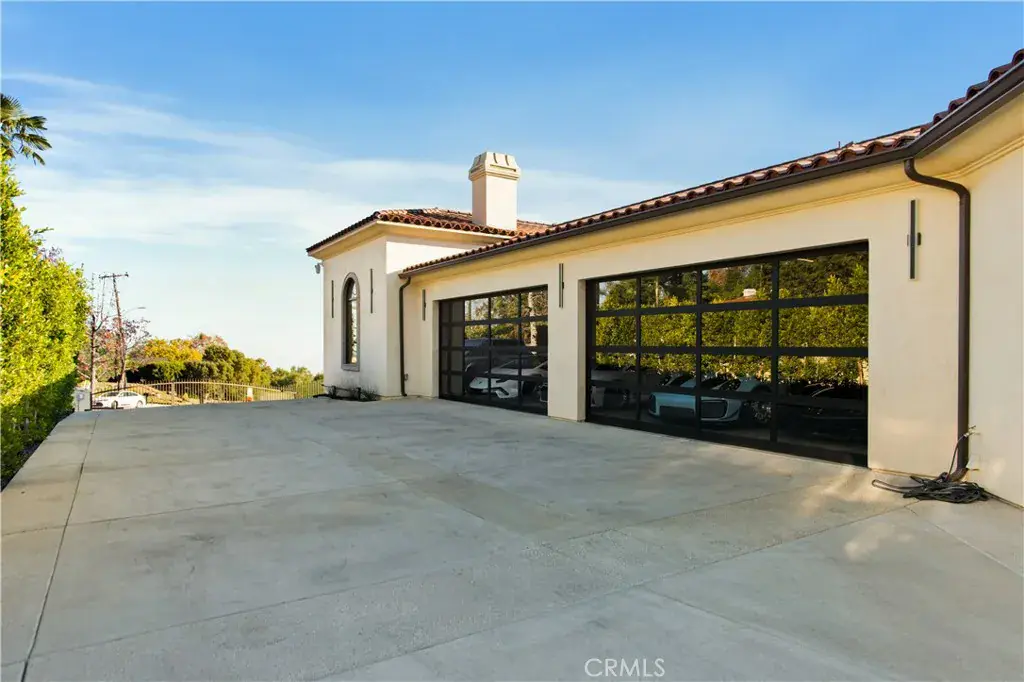 The residence showcases refined Mediterranean-inspired architecture paired with a sophisticated, modern interior. A striking entry with oversized double doors opens to expansive ceiling heights, arched windows, and a light-filled open floor plan. Elevated positioning enhances the sense of privacy while providing unobstructed views rarely found in single-level estates.