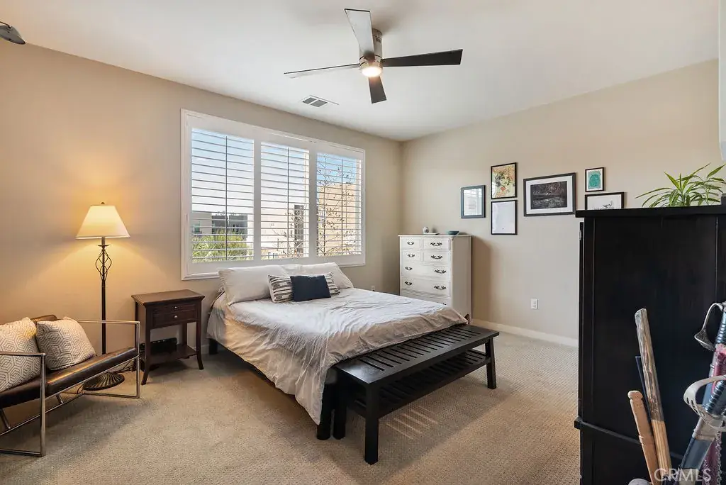 The first level features direct garage access and a versatile room ideal for a home office or additional bedroom, complete with a private patio, ADA-compliant full bathroom, custom shades, and ample flexibility. The second level opens to a bright and airy living space anchored by a sleek modern kitchen with stainless steel appliances, white cabinetry, and elegant stone granite countertops. A spacious pantry offers additional storage or the perfect spot for a custom coffee station. Step out onto the living room balcony to enjoy your morning coffee with peaceful community views. A convenient guest bathroom on this level makes entertaining easy.Upstairs, the third level boasts two generously sized primary suites, each featuring deep walk-in closets, double-sink vanities, and beautiful mountain views. A dedicated laundry room with storage sits conveniently between the suites. Natural light fills every level, enhancing the open layout. Custom plantation shutters accent the windows, complementing the rich wood flooring and light-colored carpeting throughout. Residents enjoy resort-style amenities including a community pool and BBQ areas, all while being just minutes from Target, shopping, dining, the mall, and quick access to the 10 and 210 freeways.