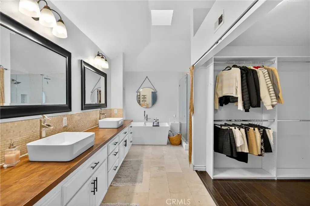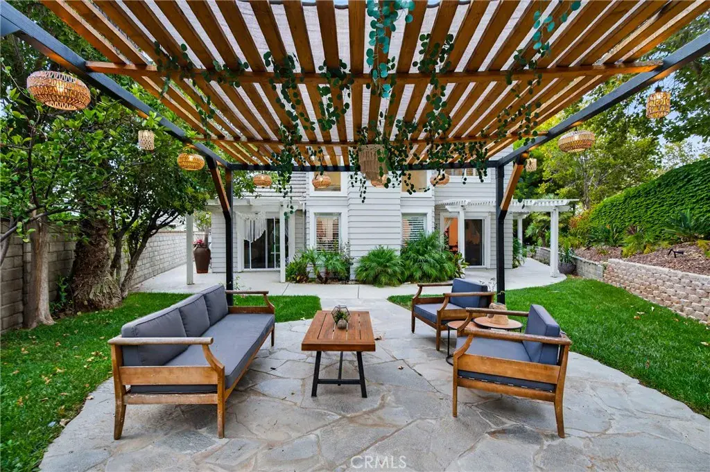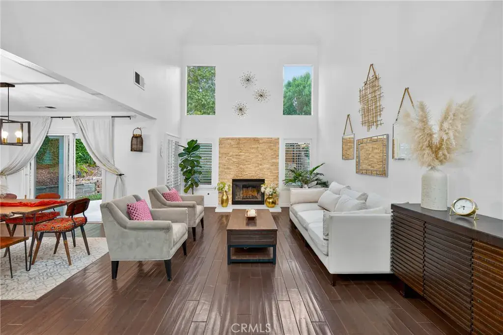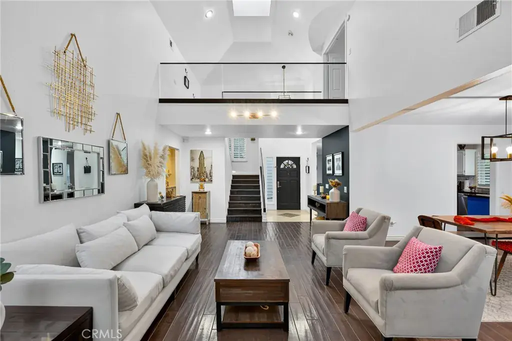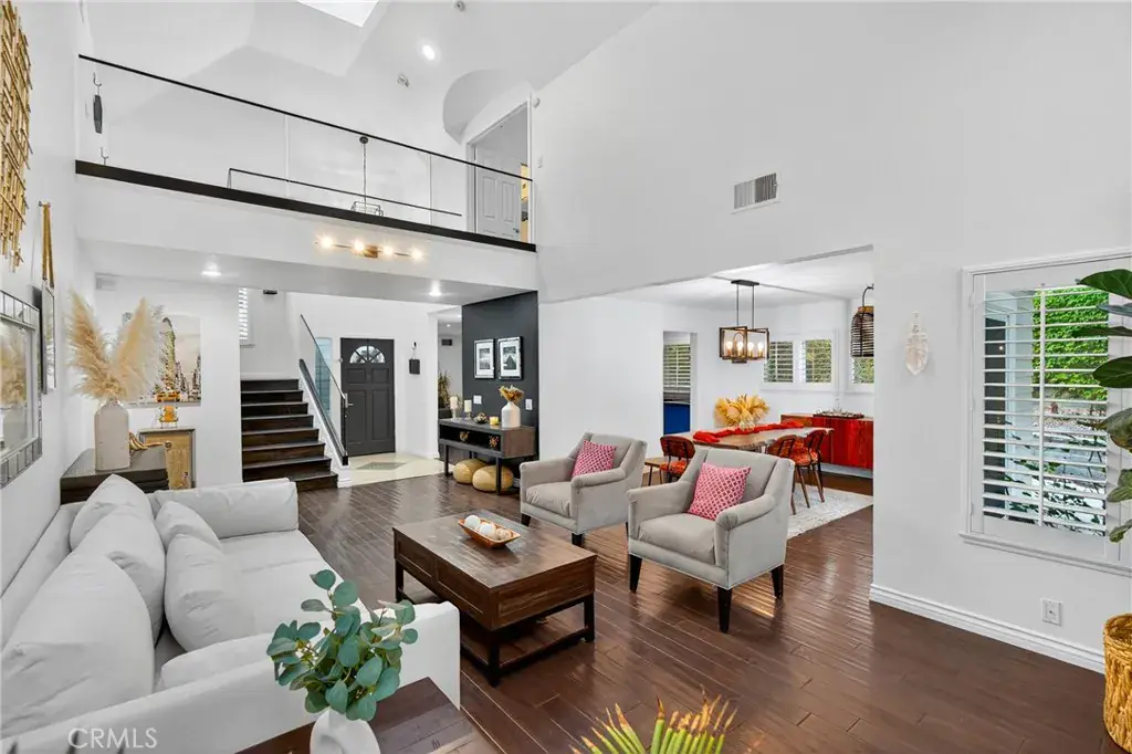Highly sought-after Chelsea model located on a quiet cul-de-sac in the prestigious Valencia Summit. This 3-bedroom, 3-bath home spans over 2,100 sq. ft. and features a soaring two-story living room with high ceilings, rich wood flooring, and abundant natural light. The updated granite kitchen includes custom cabinetry, stainless steel appliances, gas range, and multiple spaces for outdoor dining. A formal dining room with sliding doors makes entertaining seamless. The first floor offers 2 bedrooms, 2 baths, laundry room, and ample storage. Upstairs, the primary suite boasts vaulted ceilings, window seat, and a luxurious bath with dual sinks, marble floors, soaking tub, and separate shower. Wrap-around backyard gives tons of privacy. Community amenities include pools, spas, tennis courts, clubhouse, picnic areas, and scenic trails. Conveniently close to Valencia Town Center, COC, CalArts, dining, shopping, and freeway access.