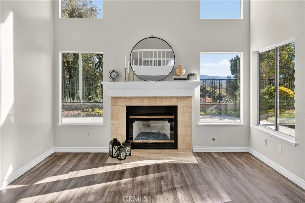 Lovely three-bedroom home perfectly situated on a quiet cul-de-sac in the highly sought-after Valencia Summit. Set on an expansive 8,263 sq ft lot, this property showcases breathtaking panoramic views and an inviting blend of comfort and style. Step inside to soaring ceilings, abundant natural light, and fresh updates including neutral interior paint, new carpet, LVP flooring, and charming farmhouse-style lighting. Enjoy two cozy fireplaces-one in the living room and one in the family room-creating warm spaces to relax and entertain.