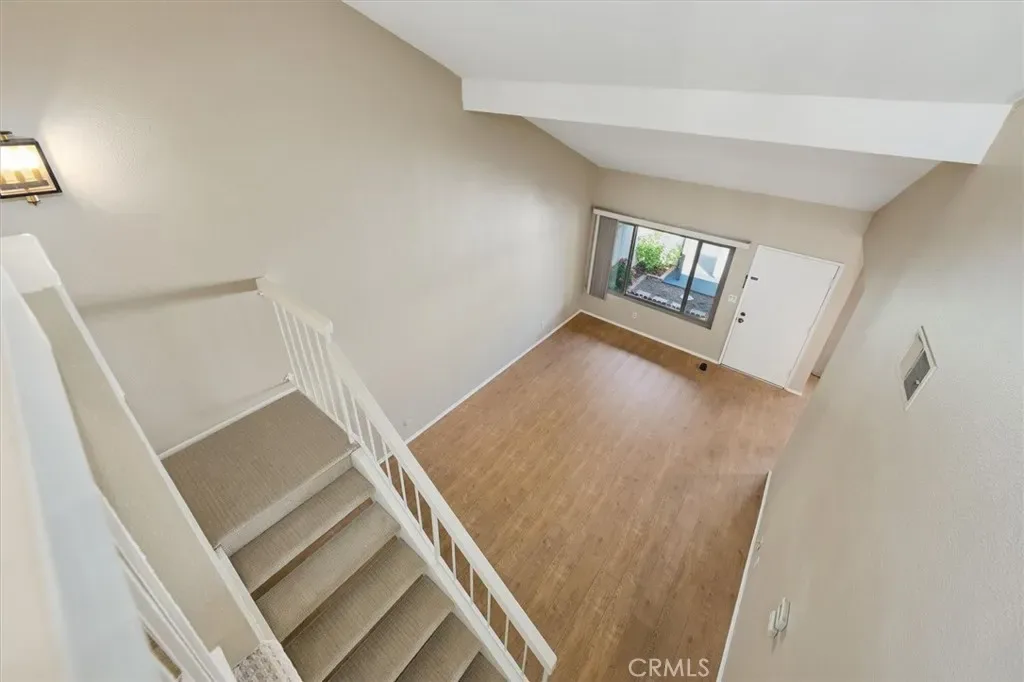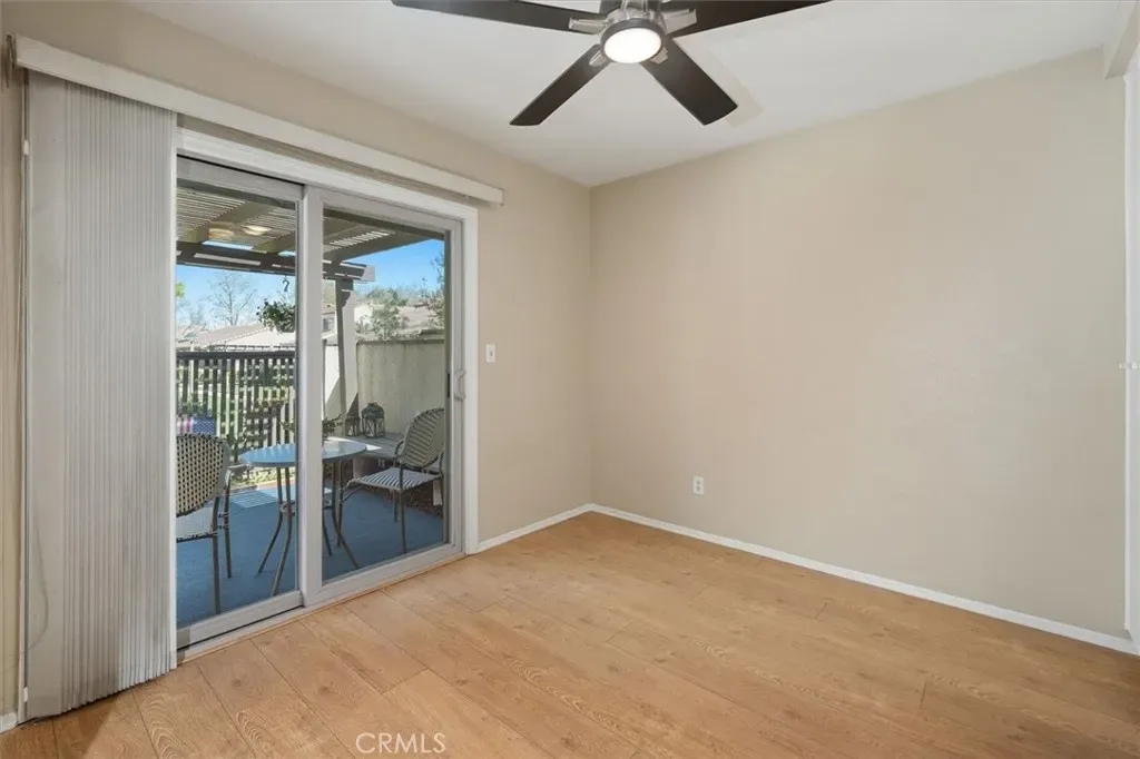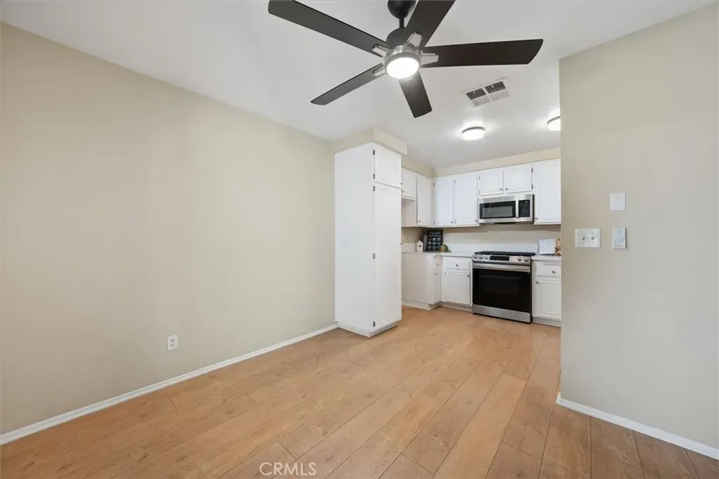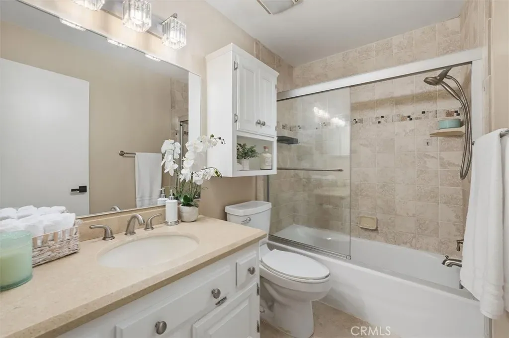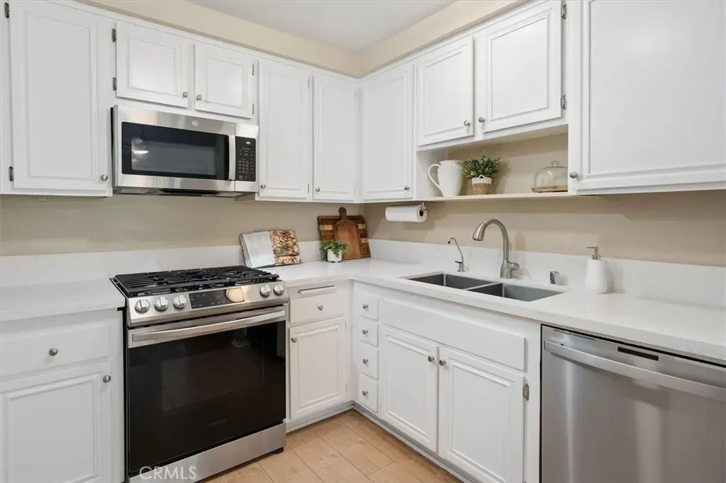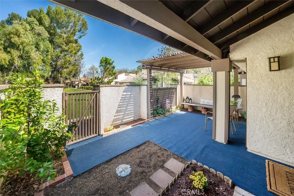This stunning 2-bedroom, 2-bath townhome in the highly sought-after Valencia Fairways community is tucked into a quiet back corner with no front neighbors and views of the lush parklike greenbelt—creating a peaceful retreat you’ll love coming home to. A charming, greenery-filled patio sets the tone for relaxed outdoor living, perfect for morning coffee or evening unwinding. Inside, soaring ceilings and abundant natural light create an open, airy ambiance. The thoughtfully updated kitchen is a true highlight, featuring stainless steel appliances, quartz countertops, and contemporary finishes—ideal for both everyday living and effortless entertaining. Recent upgrades including Milgard dual pane windows, fresh interior paint, new carpet, and luxury vinyl plank flooring provide a crisp, modern feel throughout. Upstairs, two spacious bedrooms offer comfort and versatility, complemented by a beautifully updated bathroom.