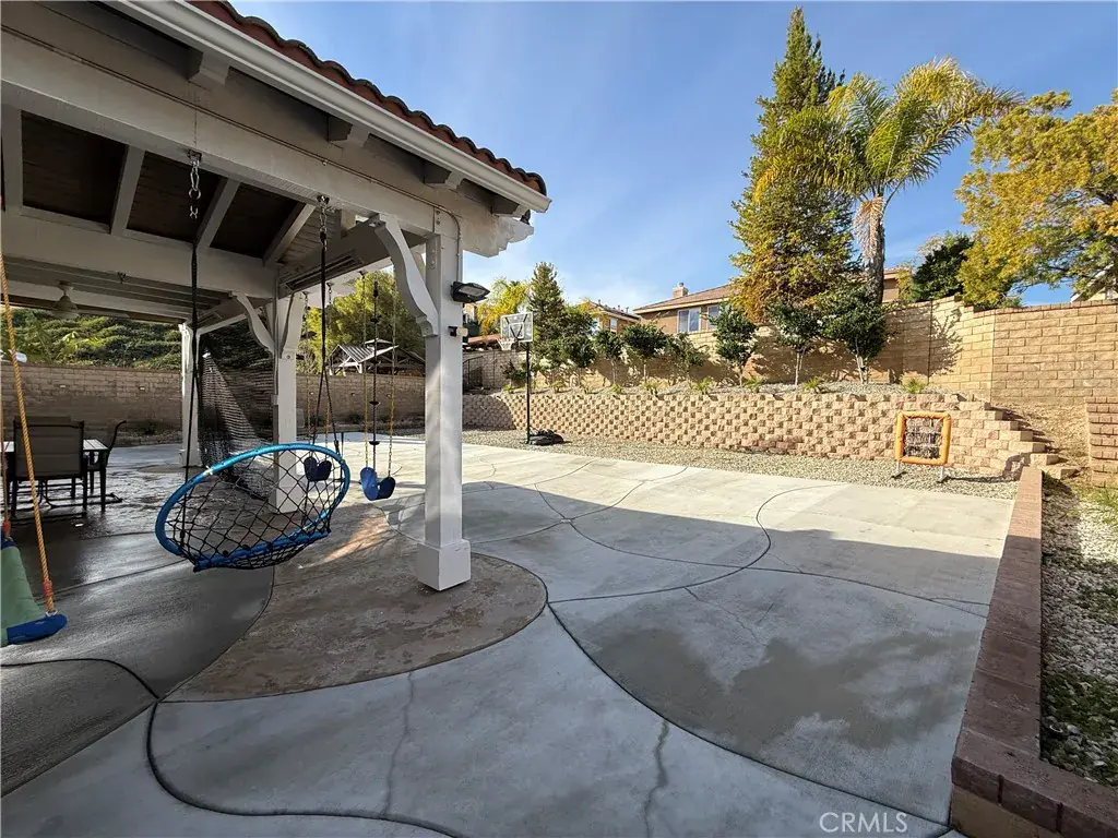 Welcome to this beautiful Tesoro del Valle home. Open concept floorplan, with lot of natural light, and a spacious kitchen with a lot of storage space will satisfy all your entertaining dreams. KitchenAid appliances, soft close drawers/cabinets, a walk-in pantry and adjacent updated butler’s pantry are just some of the features you’ll enjoy. First floor offers recess lighting with energy efficient LED lightbulbs, a flex room off the kitchen that can be used as a large office or another bedroom, and a den/bedroom and half bath. The upstairs bedrooms all feature large closets with built-ins, and there is a loft perfect for a play room or even another bedroom. Accessible from the dining room, enter a large backyard featuring a wonderful built in patio-cover with fans and electric heaters. SOLAR PANELS ARE FULLY PAID OFF and are able to generate electricity for the entire house! Additionally, a Tesla car charger has been installed in the garage, as well as a tankless water heater. The property is equipped with a smart sprinkler system and dual Nest thermostats allowing for optimal temperature control and energy efficiency throughout the home. The garage provides plenty of space for vehicles and additional storage needs, including an accessible attic. Tesoro del Valle Master HOA delivers beautiful amenities including 2 pools, a clubhouse, tennis courts, a playground & a beautiful duck pond, a gym and volleyball court. This home is also walking distance to a top rated Elementary & Junior High School. Do not miss this modern home that combines sustainability and comfort!