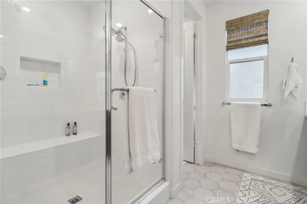 Upstairs, enjoy a versatile loft space ideal for a home office, media room, or play area. The spacious primary suite offers a walk-in closet, dual-sink quartz vanity, beautifully tiled walk-in shower, and direct access to a large covered patio, creating the perfect private retreat. Two additional guest bedrooms, a full secondary bath with separate tub and shower area, and an upstairs laundry room with extra storage complete the second floor.