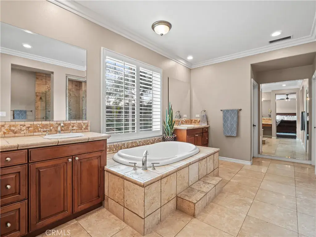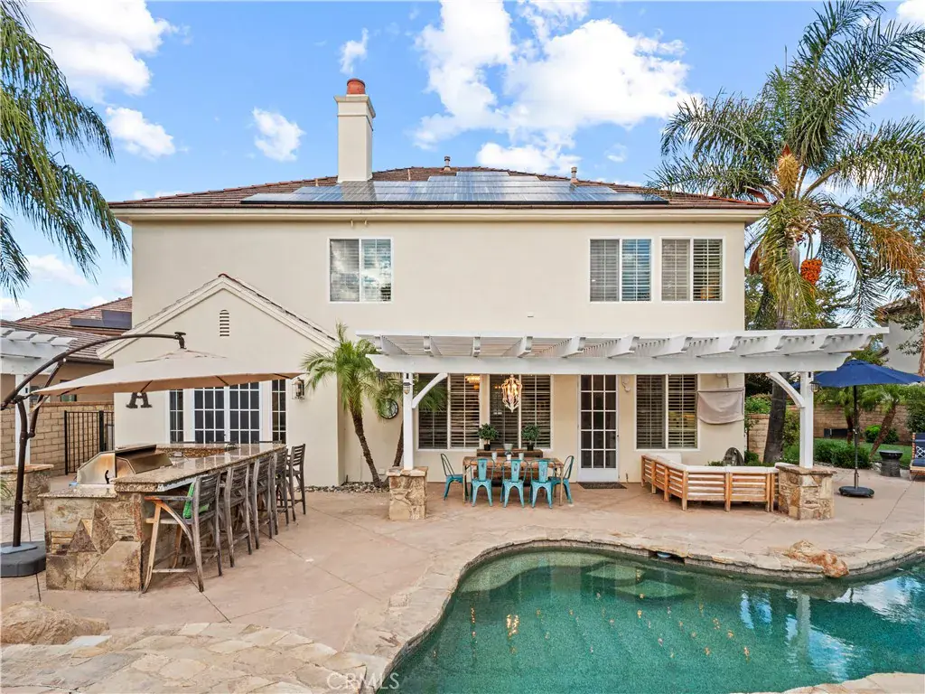 Luxurious Westridge Pool Home, Located on a cul-de-sac with over 14,000 SQFT of space, this stunning 5-bedroom, 4.5-bath home offers nearly 4,000 SQFT of upgraded living with $200K in improvements and solar! Step inside to find a double door entry formal office with front yard views and an elegant dining room adorned with wainscoting, designer fixtures and french doors leading to the side yard. The chef’s eat-in kitchen boasts a massive island, quartz countertops, upgraded backsplash, Viking appliances including double ovens and warming drawer, a walk-in pantry, built-in desk, and breakfast nook overlooking the backyard. The kitchen opens to the spacious living room featuring a striking stone accent wall with fireplace, mantel, hearth seating, and a custom-built entertainment center. The first level also offers a powder room, mudroom/laundry area, and a large bedroom with ensuite bathroom and French doors leading to the yard—ideal for guests or multi-gen living. Upstairs, a grand staircase leads to a luxurious primary suite with a cozy fireplace and spa-like ensuite complete with soaking tub, dual sinks, vanity, glass-enclosed walk-in shower with seating, and large walk-in closet. Additional bedrooms include one with an ensuite bath, two with a Jack-and-Jill bathroom, and a versatile bonus room with built-in desks, storage, and a private balcony. Interior highlights include crown molding, upgraded flooring, shutters throughout, surround sound, new water heater, and upgraded lighting. The backyard is an entertainer’s paradise, featuring a heated pebble tech pool and spa with waterfalls and baja shelf, multiple seating areas, built-in firepit, outdoor kitchen, pergola-covered patio, lush lawn, and designer landscaping with upgraded lighting. Finished with a 3-car tandem garage and oversized driveway, this home sits within the prestigious Westridge community offering resort-style amenities including multiple pools, tennis courts, and TPC golf course. Conveniently located near award-winning schools Oak Hills Elementary, Rancho Pico Junior High and West Ranch High School, parks, restaurants, and shopping with easy freeway access. This home is a MUST see!!!