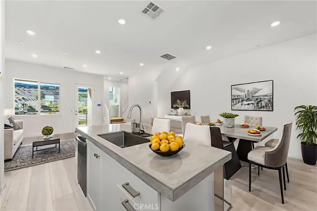 An amazing tri-level, stacked flat concept home Featuring a modern and functional layout with a spacious ground level office space perfect for working from home. The main level features an open concept design, showcasing luxury vinyl waterproof flooring, a bright family room with its own private balcony, LED lighting, a dining area, and a beautiful kitchen complete with sleek white cabinetry, stainless steel appliances, and quartz countertops. A Half bath is located on main level. Upstairs, you’ll find two roomy bedrooms, each with its own full bathroom, along with a convenient laundry area. The 2-car garage is attached with direct access to unit and offers a tankless water heater. Includes front yard private patio area. Enjoy some of the BEST HOA amenities around, including resort-style pools, a kiddie pool, a community center, outdoor fire pit with plenty of seating, picnic areas, cooking stations, community gardens, dog stations, and scenic walking trails. Centrally located near award-winning schools, golf courses, shopping at Westfield Mall, Six Flags Magic Mountain, and with easy freeway access. Come for a visit. Stay for a lifetime. Welcome home!