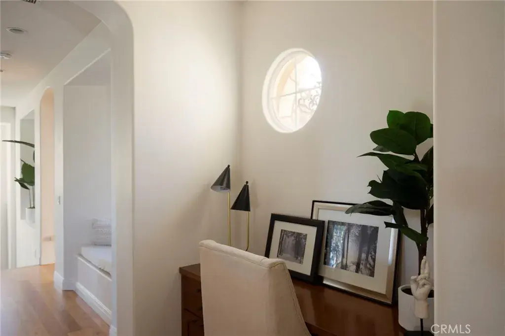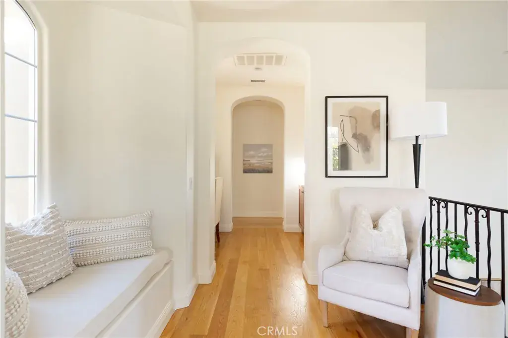 The tranquil great room continues the inviting flow, featuring an entertainer’s kitchen with upgraded appliances, butcher block and stone countertops, and seamless connection to both the dining nook (with courtyard access) and the family room—complete with a second fireplace and backyard entry.