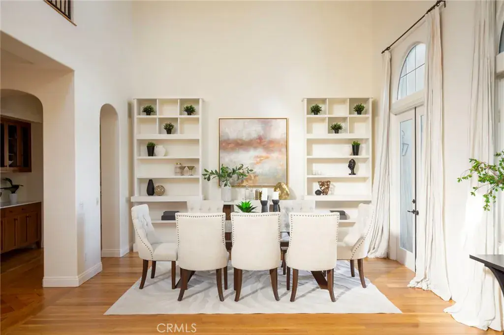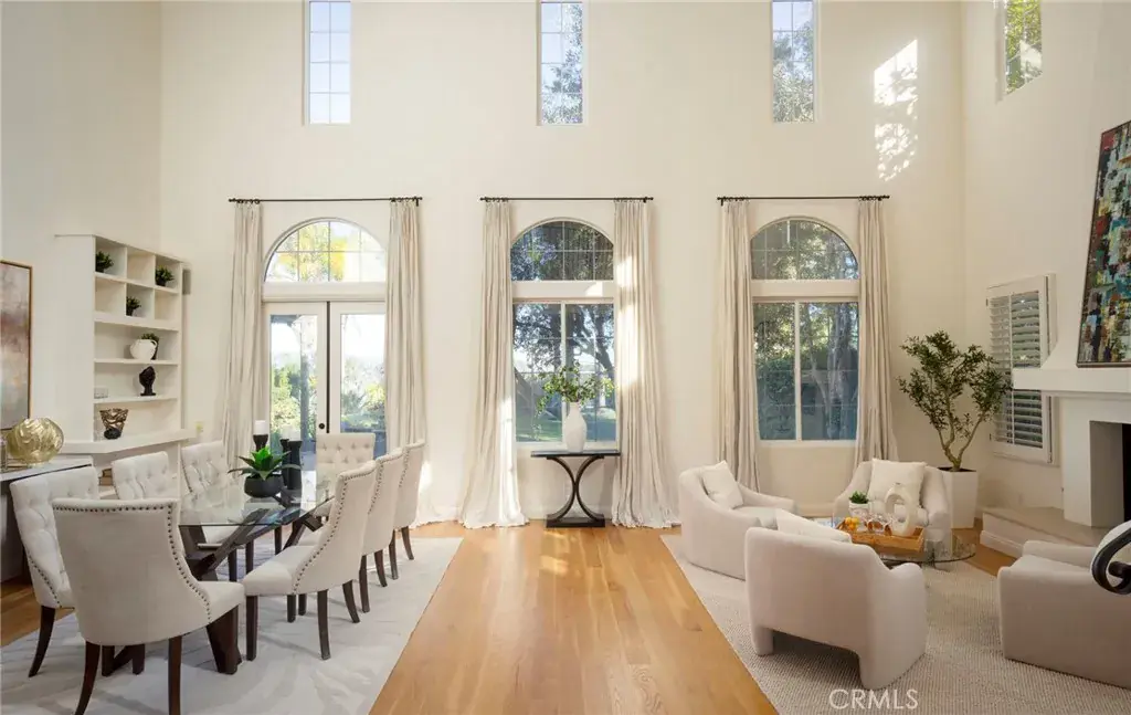Step through the private courtyard entry and into a stunning open living space with soaring double-height ceilings and expansive windows that frame the lush backyard and breathtaking views. Natural light pours in, creating the perfect setting for entertaining or relaxing by the gorgeous fireplace, surrounded by built-in bookcases and double doors leading outside.