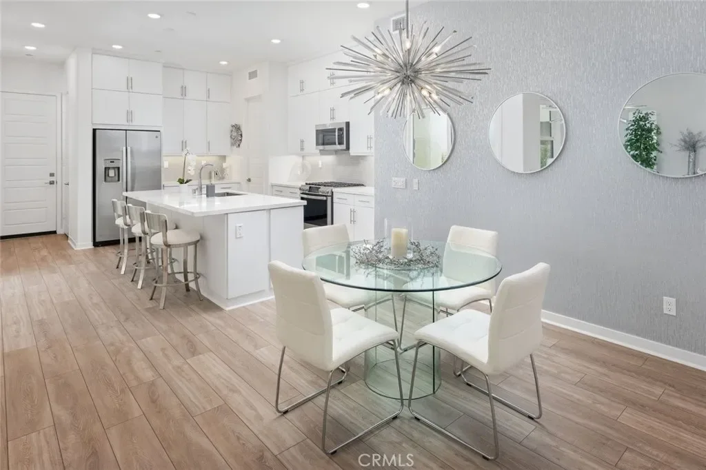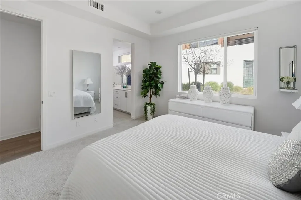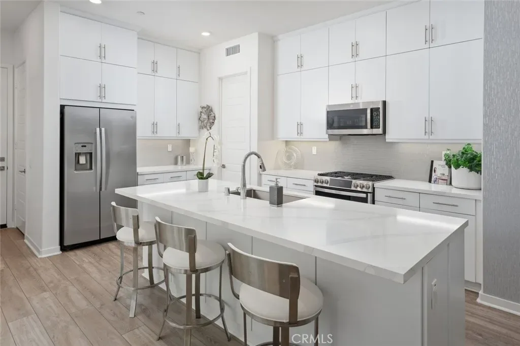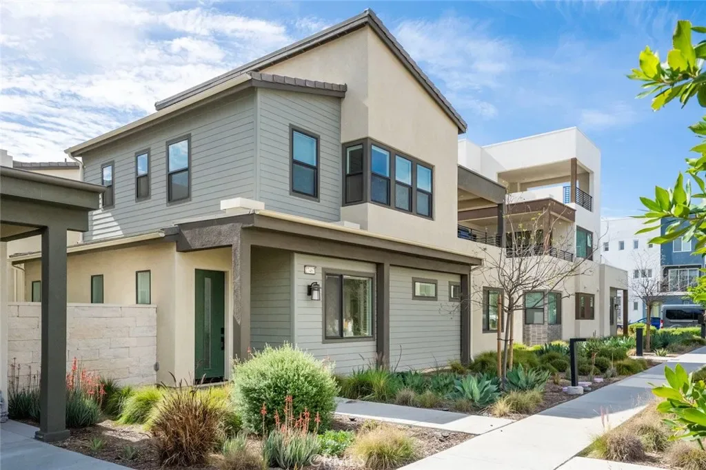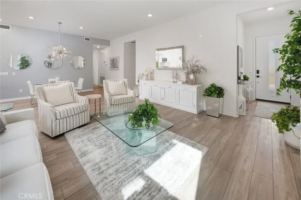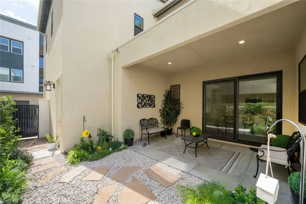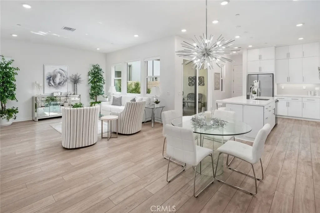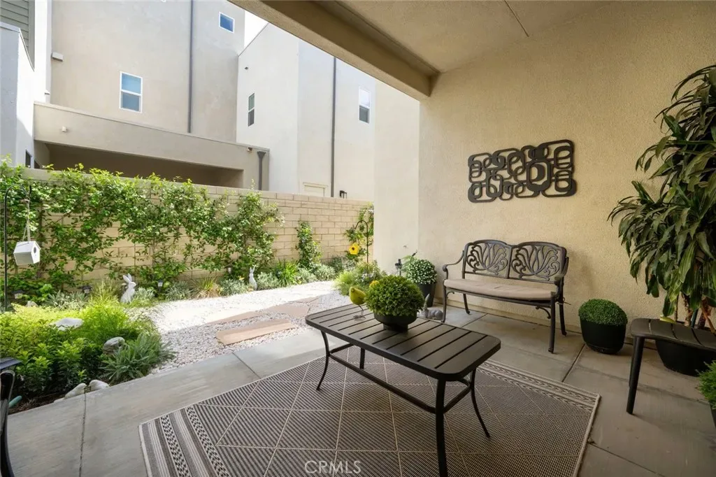 Absolutely stunning and rare 3 bed, 2 bath ground floor SINGLE STORY home in the highly sought after Rowan collection in Valencia’s coveted FivePoint community. Beautifully appointed modern home featuring an open-concept floor plan with high ceilings, large picture windows, luxury vinyl plank flooring, and tons of designer upgrades. Can be purchased fully furnished! Step inside to the large living room bathed in natural light with views of the lovely courtyard through the oversized picture windows. The bright and airy living area flows seamlessly into the dining space featuring a beautiful feature wall and eye-catching chandelier. The gourmet kitchen is an entertainer’s dream, showcasing quartz countertops, a huge island, designer backsplash, beautiful white cabinetry with brushed nickel hardware, a walk-in pantry, and high end stainless-steel appliances. From the kitchen, step through sliding glass doors to the charming and spacious covered courtyard – perfect for relaxing or outdoor get togethers. The primary suite offers plush carpeting, recessed lighting, custom window coverings, a generous walk-in closet, and a luxurious en-suite bathroom with dual quartz vanities and a walk-in shower. Two additional bedrooms include large closets, custom window coverings and abundant natural light. The full guest bath also features dual vanities, quartz counters, and a tub/shower combination. Additional highlights include a dedicated laundry room, attached two-car garage, EV charger and owned solar panels for enhanced energy efficiency. Residents of the FivePoint community enjoy resort-style amenities such as multiple pools, spas, cabanas, parks, walking trails, a recreation center, dog park, community garden, and a popular Sunday Farmer’s Market. Conveniently located near shopping, dining, and the 5 Freeway yet tucked away in a quiet community, this exceptional residence offers the perfect blend of elegance, comfort and convenience.