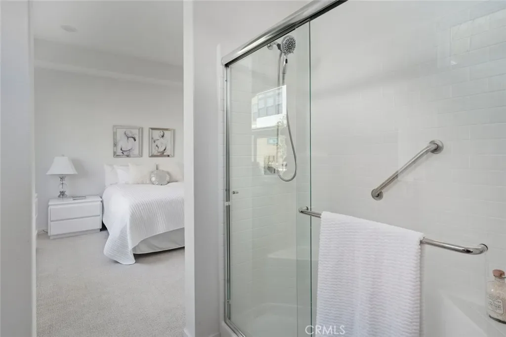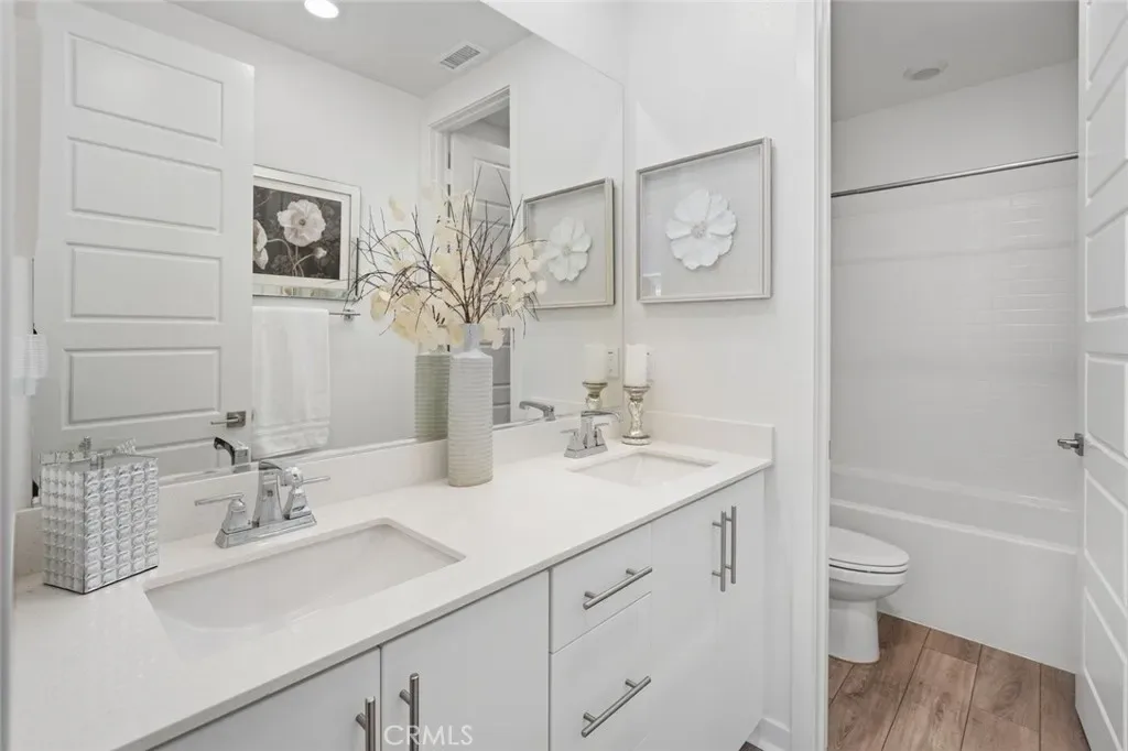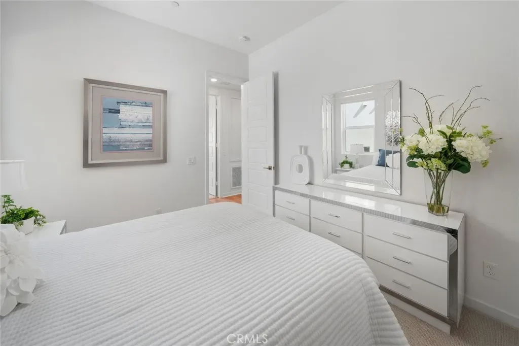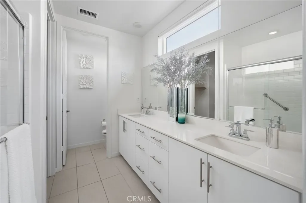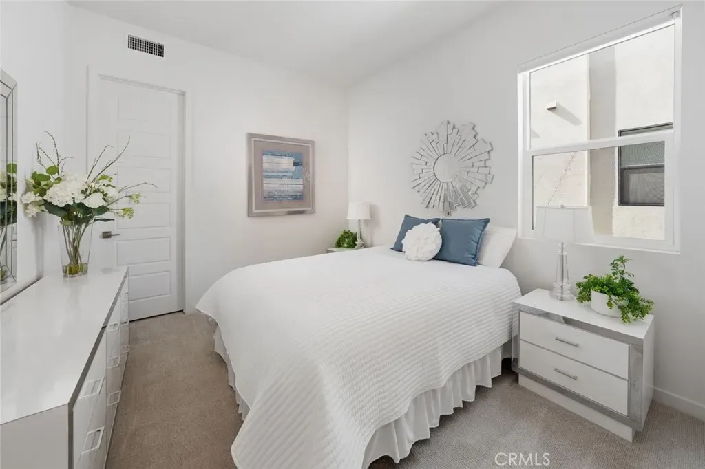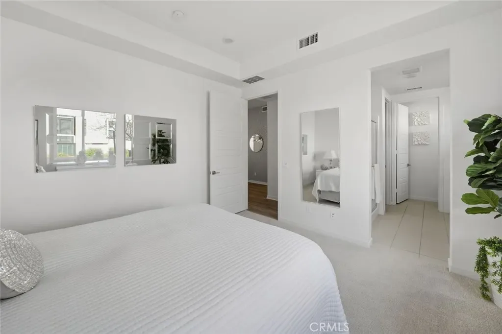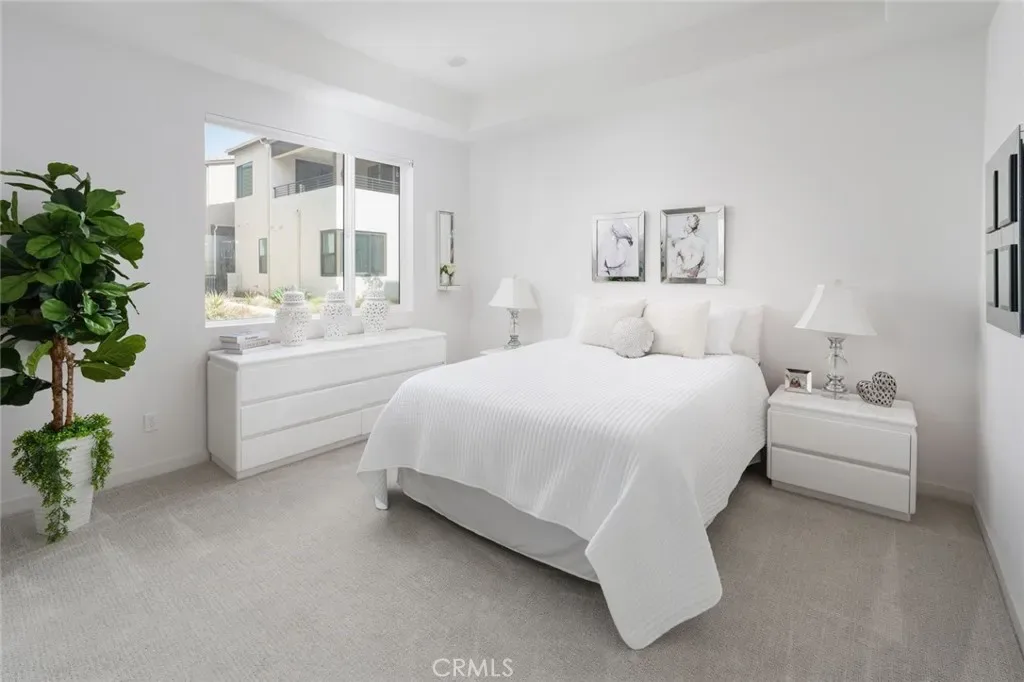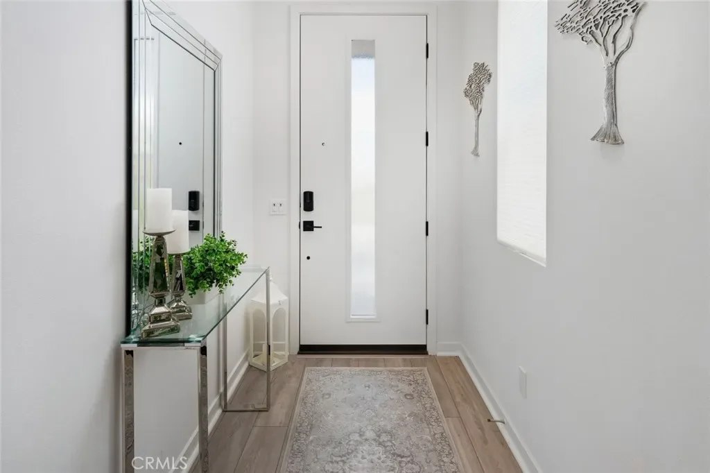 Absolutely stunning and rare 3 bed, 2 bath ground floor SINGLE STORY home in the highly sought after Rowan collection in Valencia’s coveted FivePoint community. Beautifully appointed modern home featuring an open-concept floor plan with high ceilings, large picture windows, luxury vinyl plank flooring, and tons of designer upgrades. Can be purchased fully furnished! Step inside to the large living room bathed in natural light with views of the lovely courtyard through the oversized picture windows. The bright and airy living area flows seamlessly into the dining space featuring a beautiful feature wall and eye-catching chandelier. The gourmet kitchen is an entertainer’s dream, showcasing quartz countertops, a huge island, designer backsplash, beautiful white cabinetry with brushed nickel hardware, a walk-in pantry, and high end stainless-steel appliances. From the kitchen, step through sliding glass doors to the charming and spacious covered courtyard – perfect for relaxing or outdoor get togethers. The primary suite offers plush carpeting, recessed lighting, custom window coverings, a generous walk-in closet, and a luxurious en-suite bathroom with dual quartz vanities and a walk-in shower. Two additional bedrooms include large closets, custom window coverings and abundant natural light. The full guest bath also features dual vanities, quartz counters, and a tub/shower combination. Additional highlights include a dedicated laundry room, attached two-car garage, EV charger and owned solar panels for enhanced energy efficiency. Residents of the FivePoint community enjoy resort-style amenities such as multiple pools, spas, cabanas, parks, walking trails, a recreation center, dog park, community garden, and a popular Sunday Farmer’s Market. Conveniently located near shopping, dining, and the 5 Freeway yet tucked away in a quiet community, this exceptional residence offers the perfect blend of elegance, comfort and convenience.