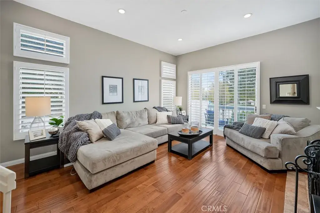 This home also features a direct-access two-car garage where the washer and dryer are included for added convenience. Throughout the home, upgraded wood floors and shutters create a unified and polished aesthetic. The backyard is neatly landscaped and offers a peaceful, private setting with a covered patio—ideal for outdoor dining, entertaining, or simply enjoying the California sunshine.