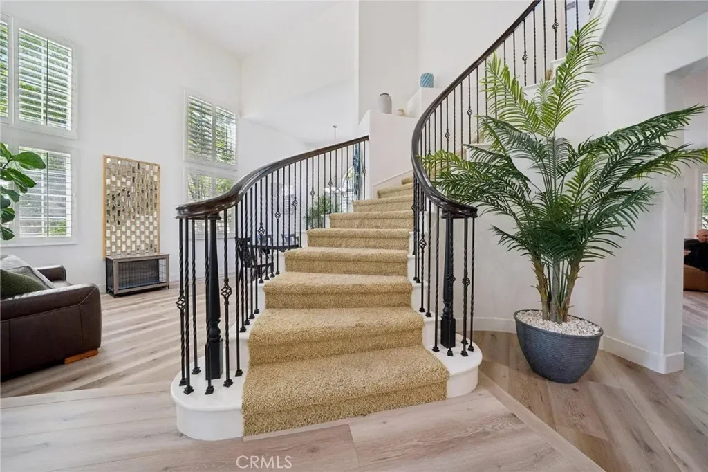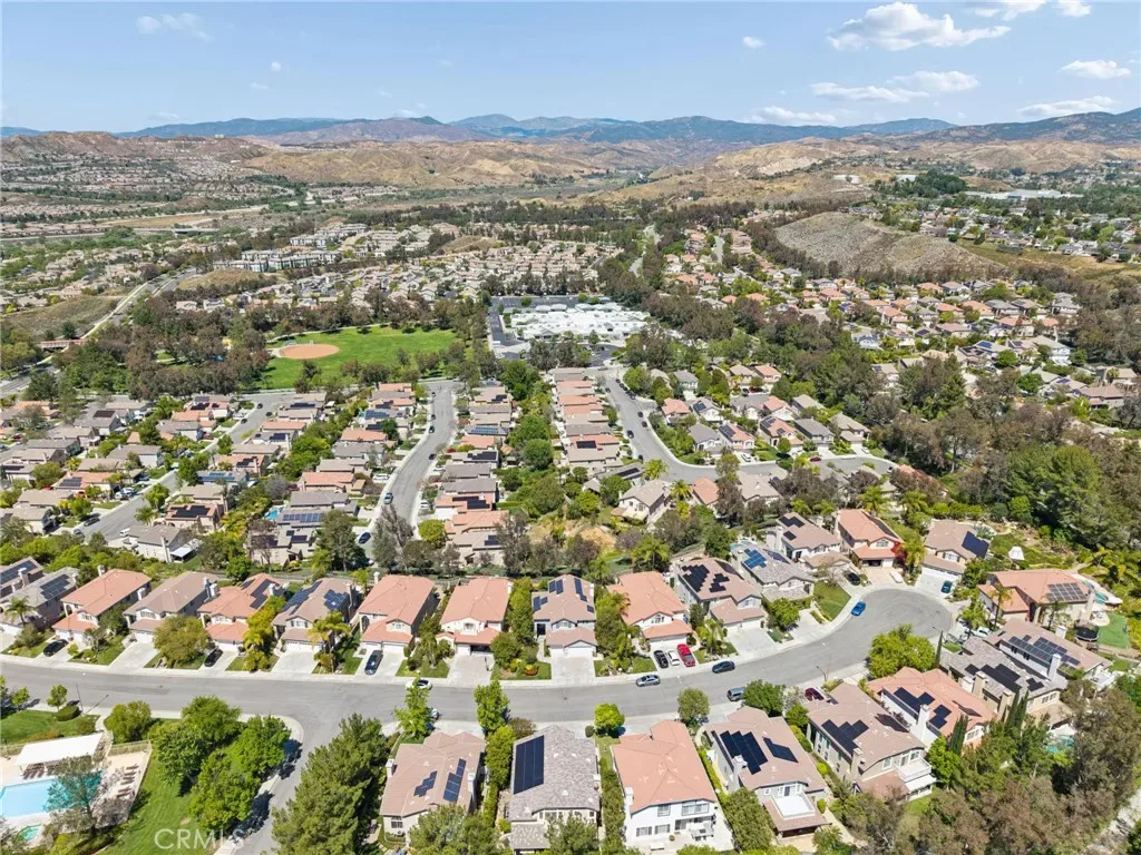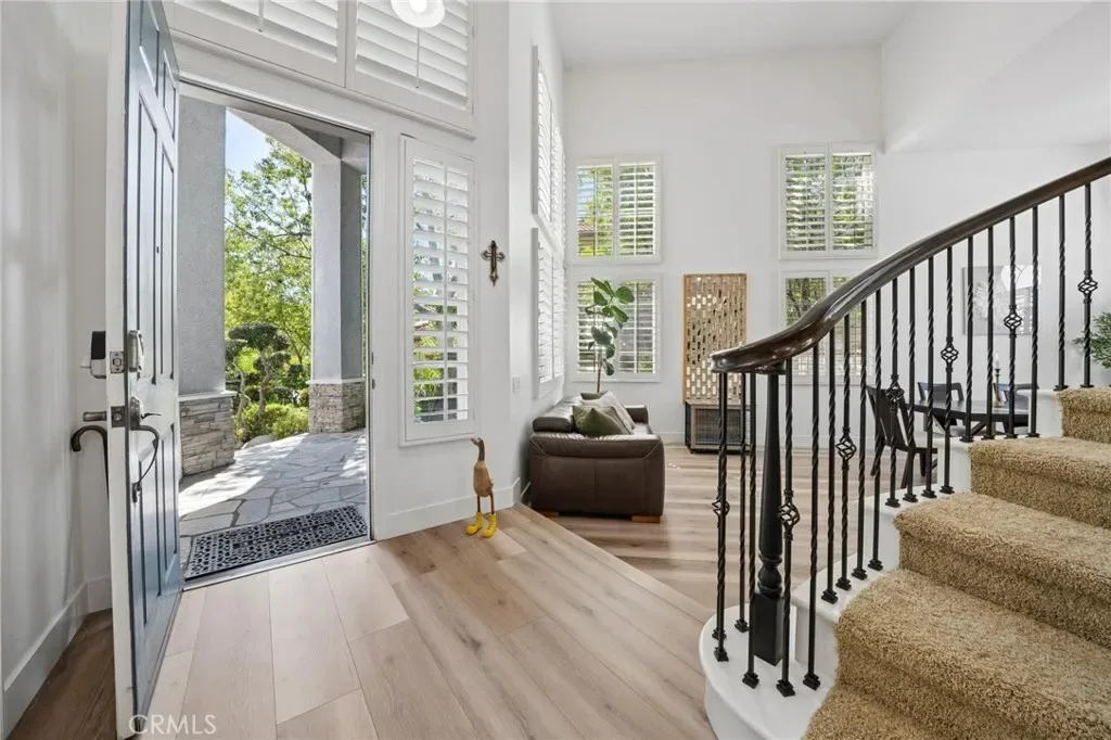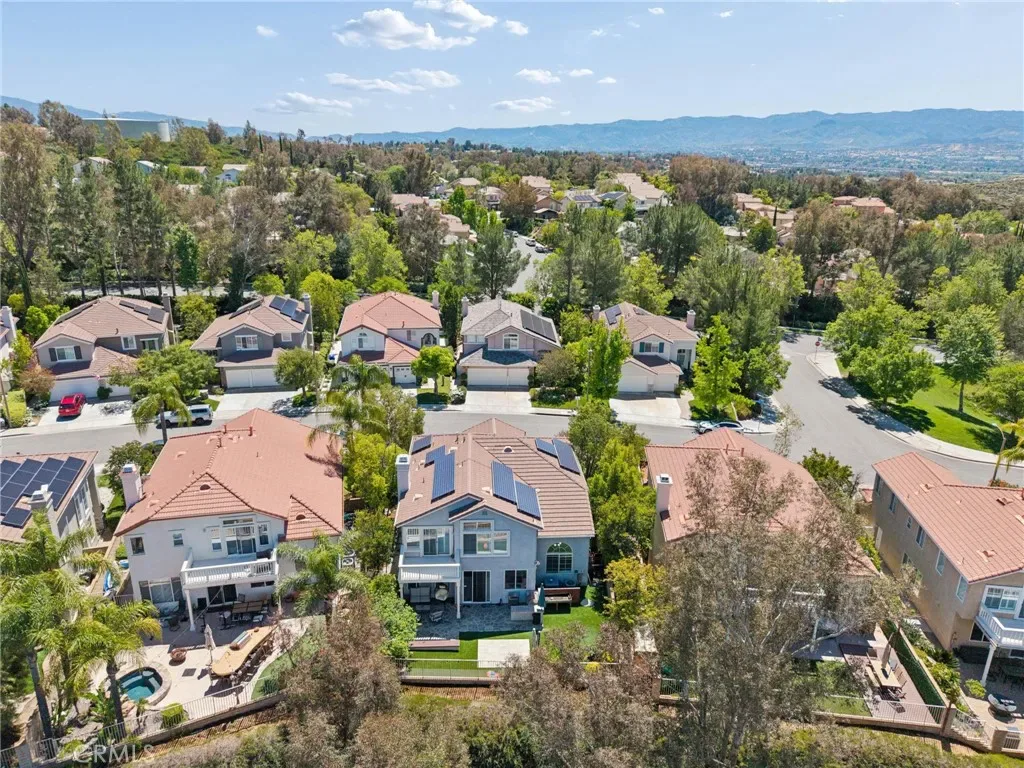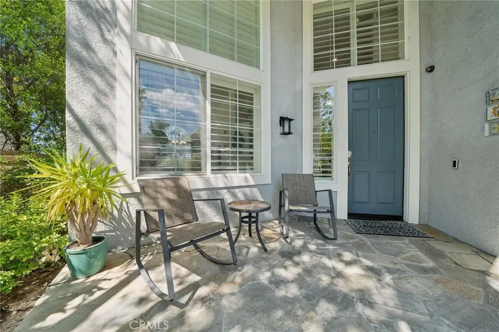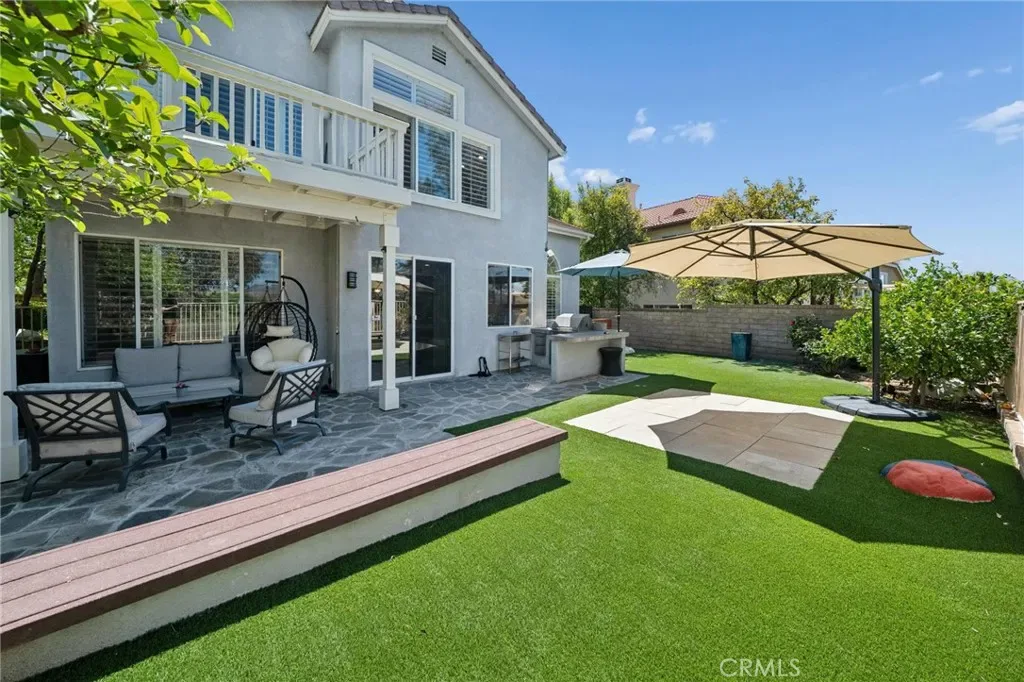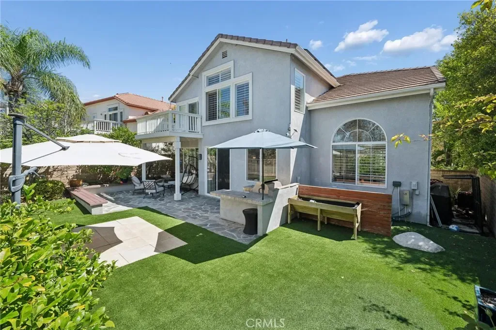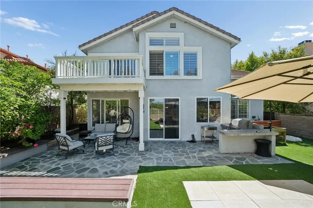 Welcome to one of the most sought-after neighborhoods in Valencia. Ideally situated on a cul-de-sac within the desirable Northpark community, this beautifully upgraded home offers the perfect blend of comfort, style, and functionality, and includes OWNED SOLAR for added efficiency and long-term savings. Newer waterproof laminate flooring flows seamlessly throughout, creating a clean, modern foundation. The upgraded kitchen features custom cabinetry, newer quartz countertops, and a full-height quartz backsplash, delivering a sleek and cohesive design. Plantation shutters add timeless appeal, while a newer wrought iron staircase creates a striking architectural focal point. A custom barn door enhances the downstairs office, offering both style and versatility. The main level also includes a full bathroom with granite countertops, tile flooring, and a walk-in shower, along with a convenient laundry room complete with a utility sink. Upstairs, the spacious primary suite features a private balcony overlooking the backyard with gorgeous views and a relaxing retreat area. The remodeled primary bathroom showcases custom cabinetry, a large walk-in shower, and a soaking tub. The walk-in closet is outfitted with custom built-ins for optimal organization. Two additional bedrooms and a shared bathroom complete the upper level. The backyard is designed for both entertaining and low-maintenance living, featuring a covered patio, turf landscaping, a built-in BBQ, and mature fruit trees, including apple and lemon. A spacious three-car garage completes this exceptional home. NO MELLO ROOS and low HOA which features tennis courts, multiple pools and spas, clubhouse, basketball, outdoor BBQ and more!