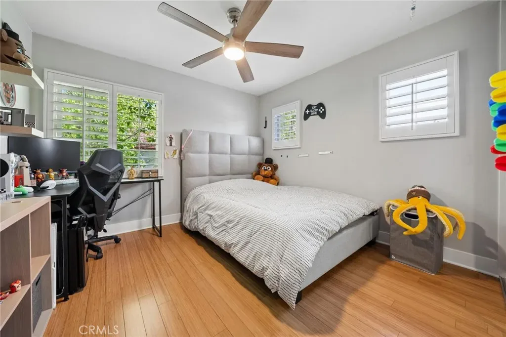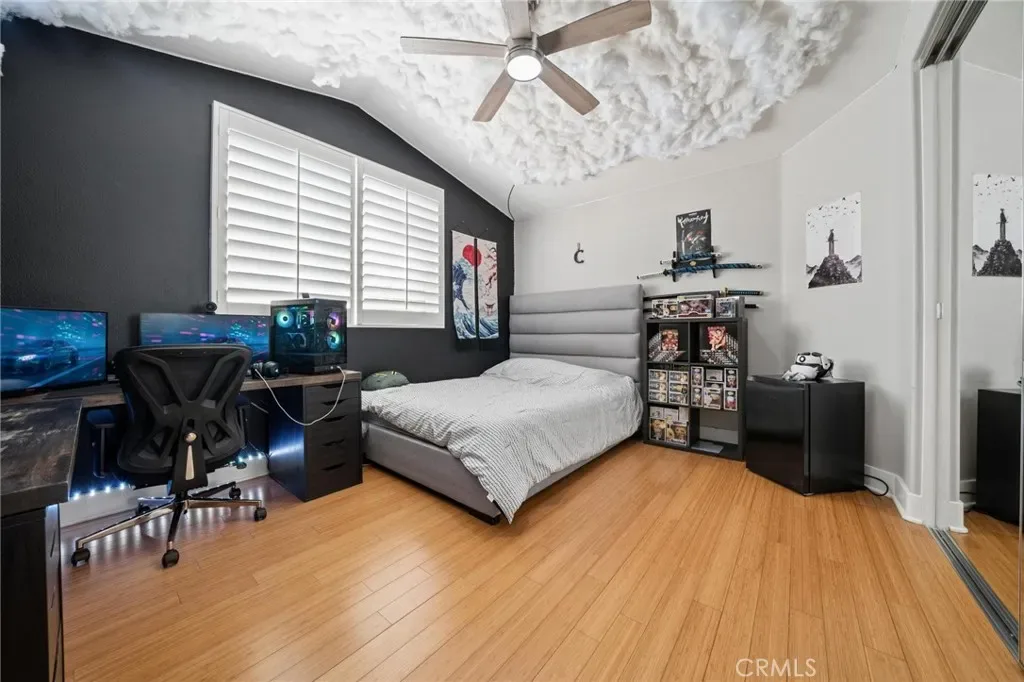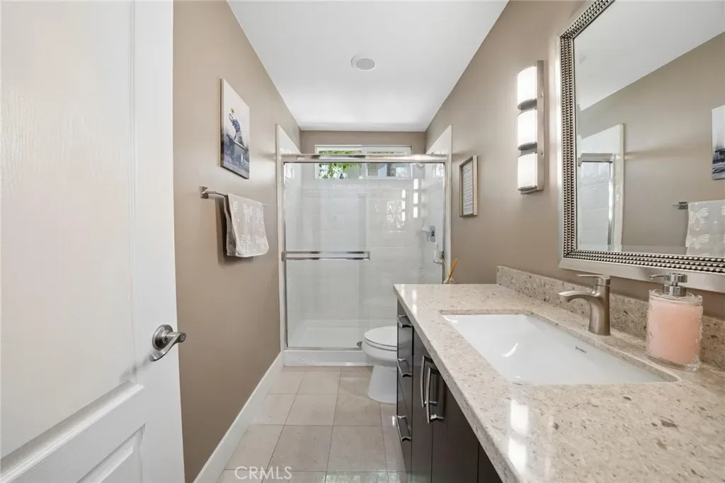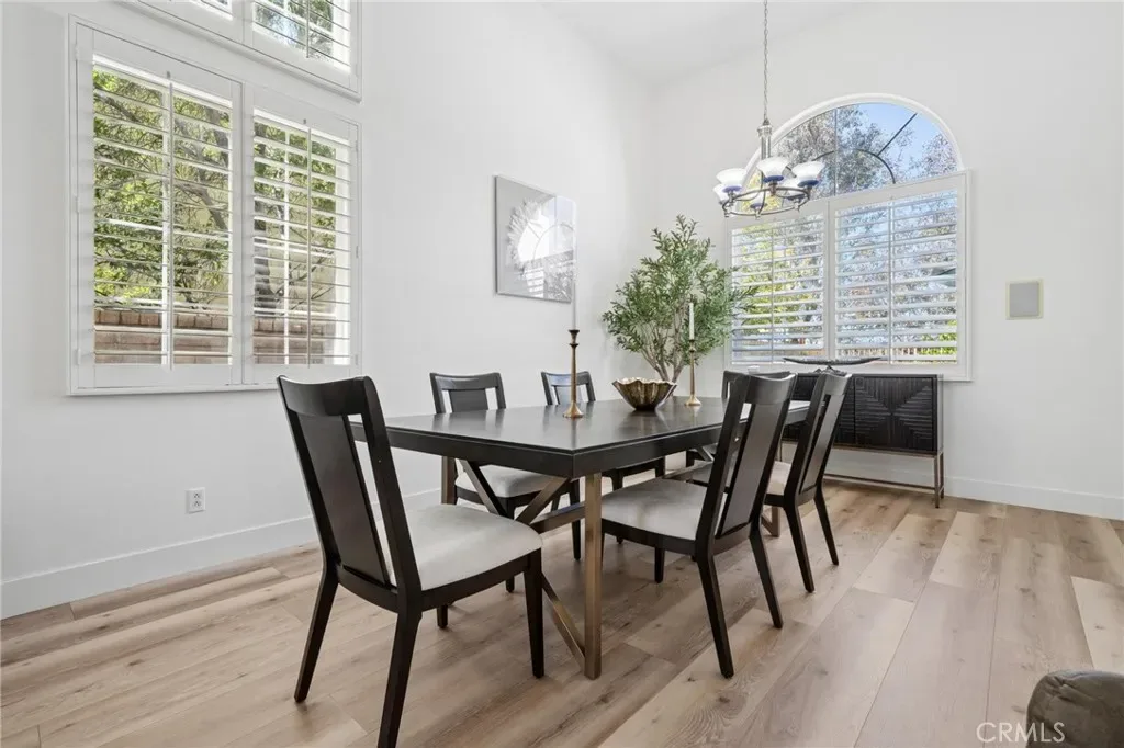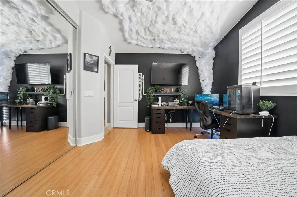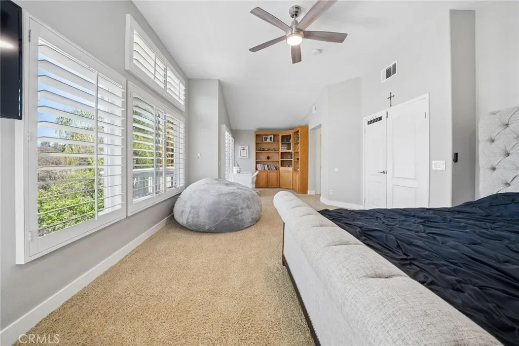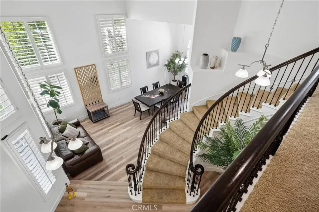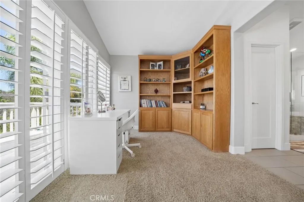 Welcome to one of the most sought-after neighborhoods in Valencia. Ideally situated on a cul-de-sac within the desirable Northpark community, this beautifully upgraded home offers the perfect blend of comfort, style, and functionality, and includes OWNED SOLAR for added efficiency and long-term savings. Newer waterproof laminate flooring flows seamlessly throughout, creating a clean, modern foundation. The upgraded kitchen features custom cabinetry, newer quartz countertops, and a full-height quartz backsplash, delivering a sleek and cohesive design. Plantation shutters add timeless appeal, while a newer wrought iron staircase creates a striking architectural focal point. A custom barn door enhances the downstairs office, offering both style and versatility. The main level also includes a full bathroom with granite countertops, tile flooring, and a walk-in shower, along with a convenient laundry room complete with a utility sink. Upstairs, the spacious primary suite features a private balcony overlooking the backyard with gorgeous views and a relaxing retreat area. The remodeled primary bathroom showcases custom cabinetry, a large walk-in shower, and a soaking tub. The walk-in closet is outfitted with custom built-ins for optimal organization. Two additional bedrooms and a shared bathroom complete the upper level. The backyard is designed for both entertaining and low-maintenance living, featuring a covered patio, turf landscaping, a built-in BBQ, and mature fruit trees, including apple and lemon. A spacious three-car garage completes this exceptional home. NO MELLO ROOS and low HOA which features tennis courts, multiple pools and spas, clubhouse, basketball, outdoor BBQ and more!