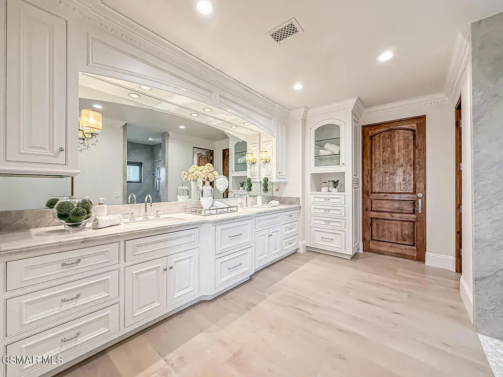 Welcome Home. The property is nestled within the prestigious, gated community of Westridge Estates. This exceptional residence offers privacy, beauty, and timeless elegance. The neighborhood features mature tree-lined streets, wide roadways, and low HOA dues–creating a peaceful and inviting atmosphere. Situated on a quiet cul-de-sac, the property enjoys breathtaking views of rolling mountains and treetops from the balcony. Inspired by Mediterranean architecture, the home showcases refined details and graceful lines–from smooth bullnose corners and curved archways to newly installed designer light fixtures that set a warm, sophisticated ambiance throughout. This residence has been extensively upgraded with superior materials and craftsmanship. From the impressive double-door entry to the added picture windows, every detail has been thoughtfully curated. Designer corkboard wallpaper with subtle metallic silver and gold accents flows throughout much of the first floor, adding texture and understated luxury. Designed for Living & Entertaining Offering approximately 5,652 square feet of living space (per assessor), the home is both expansive and inviting. The formal living room flows seamlessly into the dining room, while the open-concept family room and kitchen create an ideal setting for everyday living and entertaining. Warm faux wood beams add character and architectural interest. This is California living at its finest. Enjoy surround sound, a motorized Nano Wall that effortlessly connects indoor and outdoor spaces, and a resort-style backyard featuring an outdoor fireplace, built-in barbecue, private pool, and spa. A beautifully designed enclosed patio cover allows for year-round entertaining, while the grassy yard and fruit trees complete this serene retreat. Culinary Delight The chef’s kitchen is as stunning as it is functional, filled with natural light and designed for both entertaining and serious cooking: Oversize island single slab Calcutta Gold Quartz plus countertops, and backsplashes Custom-built range hood with integrated spice storage Wolf 6-burner gas range with griddle and double ovens Stove top – Pot filler faucet Extensive custom cabinetry throughout Wolf stainless steel microwave, third oven, and warming drawer Sub-Zero refrigerator and freezer Sub-Zero refrigerator and freezer drawers Two stainless steel double dishwashers Under-counter ice machine Custom wine showcase cabinet with wine refrigerator and wine accessory drawer Farmhouse sink at the island plus a secondary double sink for added convenience. Comfort & Luxury The home offers five bedrooms and four-and-a-half bathrooms. Two of which are primary suites–one upstairs and one downstairs. The downstairs primary suite is a true sanctuary. An elevator, located just across the hall, provides easy access to the upstairs living areas–offering comfort, convenience, and accessibility. The staircase is a showpiece, with a captivating focal point from the newly installed light fixture. The space is amplified by the use of frameless glass railings that maximize light, enhance safety, and provide unobstructed views of your surroundings. Upstairs Living The second and third bedrooms upstairs have also been tastefully renovated, offering their own upgraded bathroom and private oversized closet. There is also a home office with custom-built-in cabinetry- showcasing your refined workspace. The upstairs primary suite is spacious, inviting, and filled with lots of luxury comforts. From the high ceilings, double French doors to gain access to your private balcony, to the frameless glass railings, and the Stunning view. The ensuite bathroom includes a soaking tub area, full-slab Taj Mahal Quartzite double shower with bench, inlay marble flooring, dual vanities, new countertops, and updated hardware. An upgraded laundry room completes the upper level, blending beauty with everyday functionality.