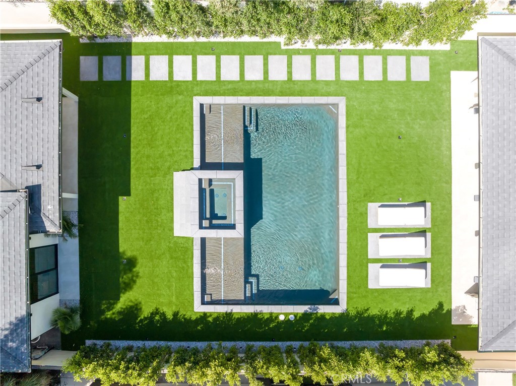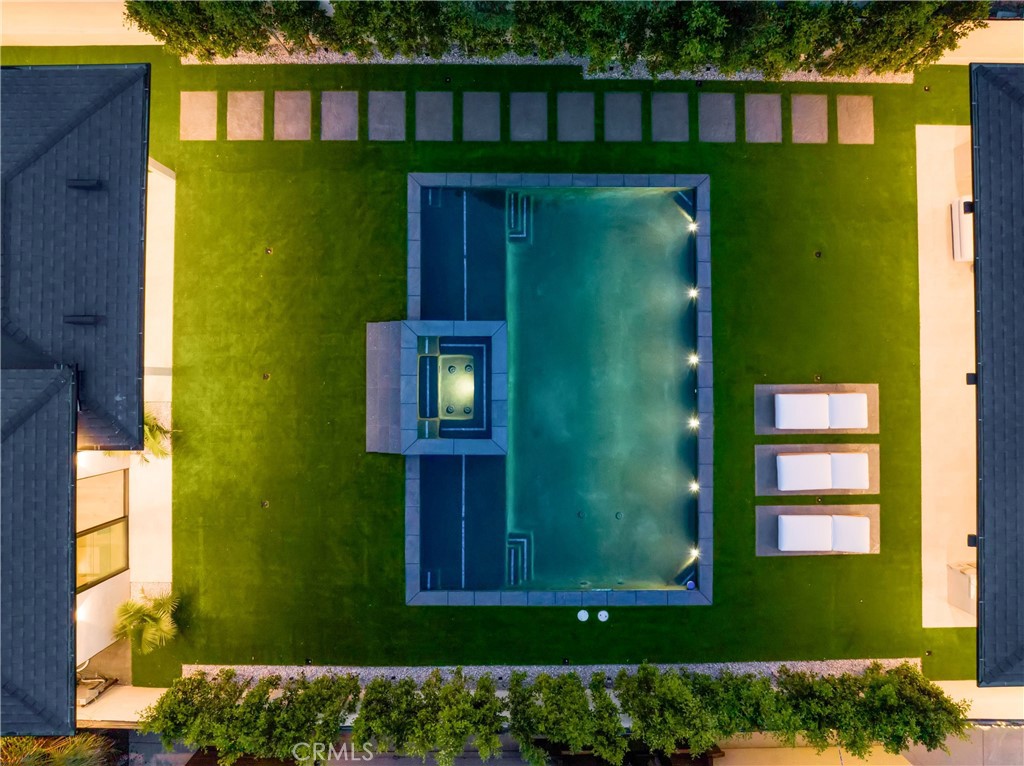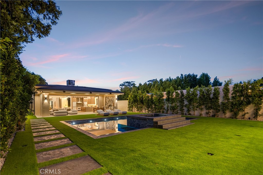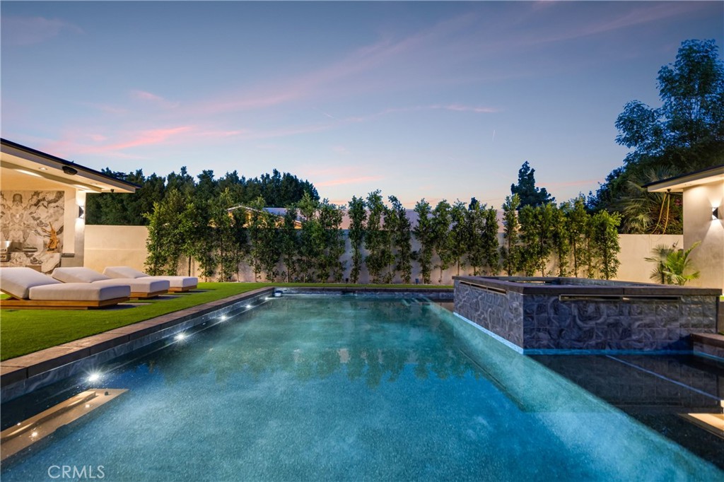 The backyard is designed for both everyday living and elevated entertaining, featuring a pool with dual baja shelves, a raised spa with a three-way waterfall, and Jandy equipment. A covered patio with its own fireplace and built-in BBQ area is framed by bookmatched porcelain slab walls, creating a striking outdoor setting.