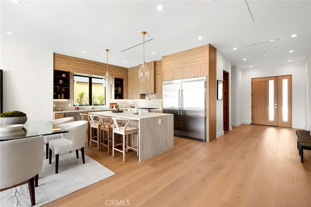 The main house boasts a seamless open-concept floor plan, ideal for both everyday living and entertaining. At the heart of the home is a gourmet chef’s kitchen, complete with top-of-the-line Thermador appliances, custom cabinetry, and generous counter space. A stylish built-in bar with sink and beverage refrigerator adds an elevated touch, perfect for hosting and entertaining with ease.