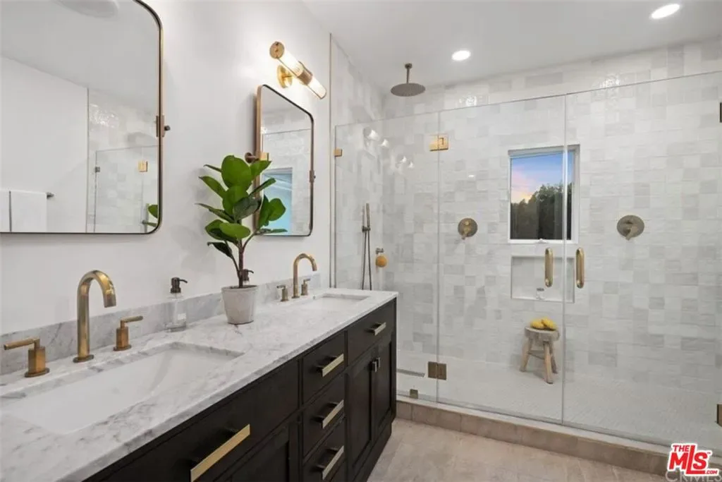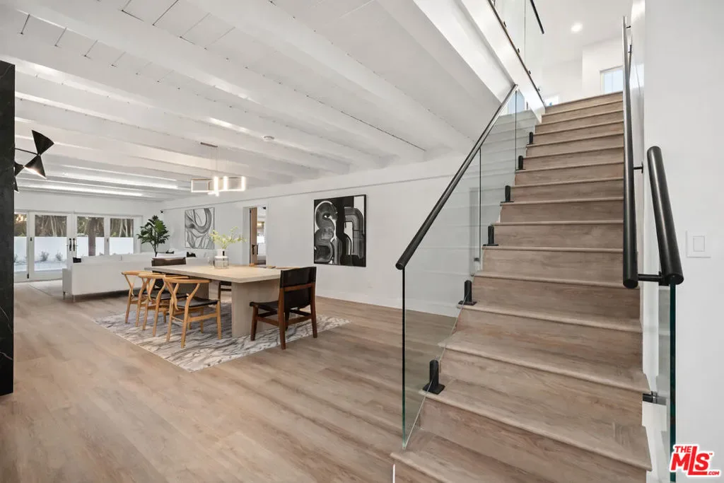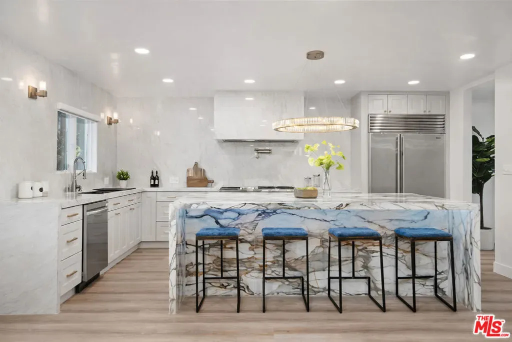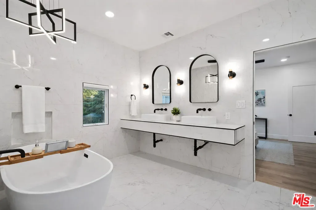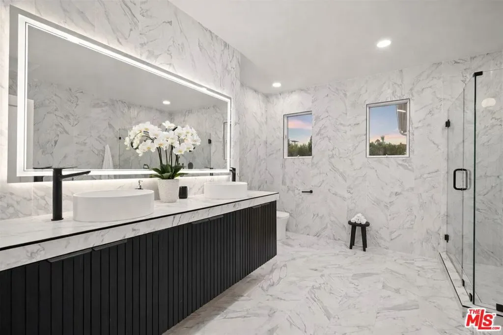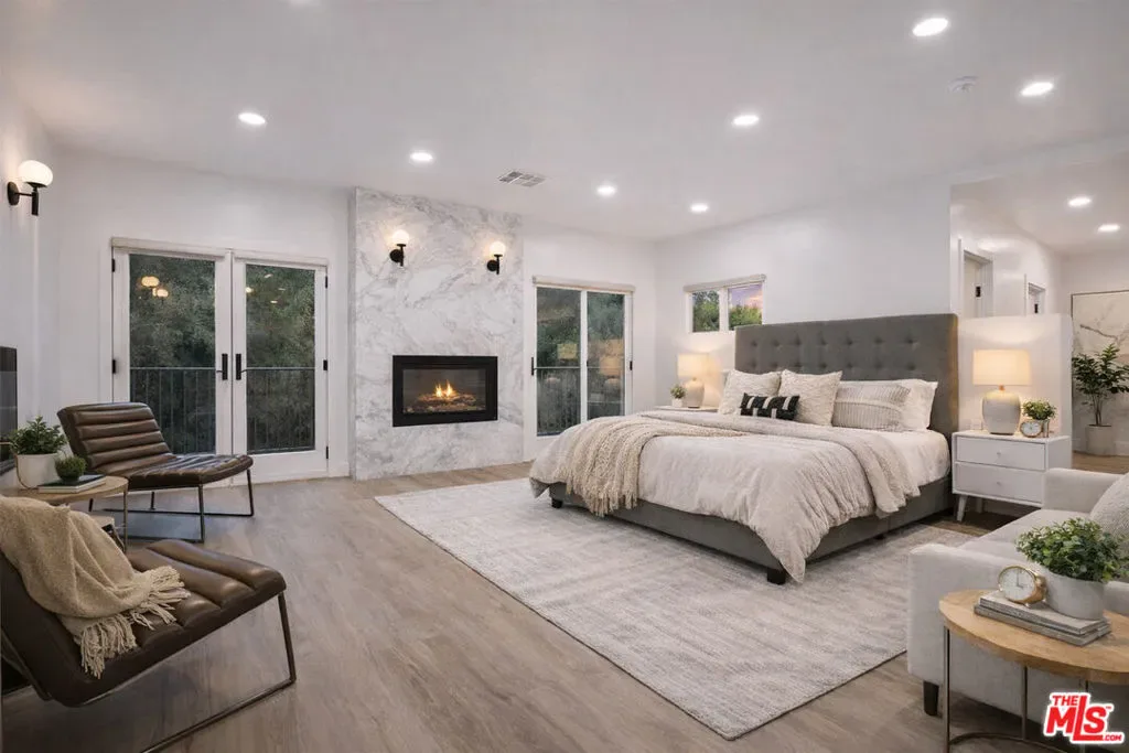 Situated in a quiet, tree-lined pocket of Valley Village, this exceptional contemporary residence offers nearly 5,000 square feet of thoughtfully designed living space on a generous 9,450 square foot lot. The home features seven bedrooms and six bathrooms, including two spacious primary suites, providing flexibility and privacy for comfortable living. Soaring ceilings and a bright open floor plan create a striking first impression, complemented by custom LED fireplaces and expansive living and family spaces ideal for both everyday living and entertaining. The chef’s kitchen is the centerpiece of the home, showcasing a porcelain waterfall island, custom cabinetry, designer porcelain countertops and backsplash, and high-end appliances.The primary suite offers a private balcony overlooking the backyard, dual walk-in closets, and a spa-inspired bathroom with dual vanities, a soaking tub, and a large glass shower. Several additional bedrooms include ensuite baths, adding comfort and convenience for family and guests.The backyard is designed for true California living, featuring a custom pool and spa, outdoor barbecue area, and lush landscaping that creates a private, resort-style setting. Located near top-rated schools, shopping, dining, and the conveniences of Burbank Boulevard, this Valley Village home offers the perfect blend of luxury, space, and modern design.