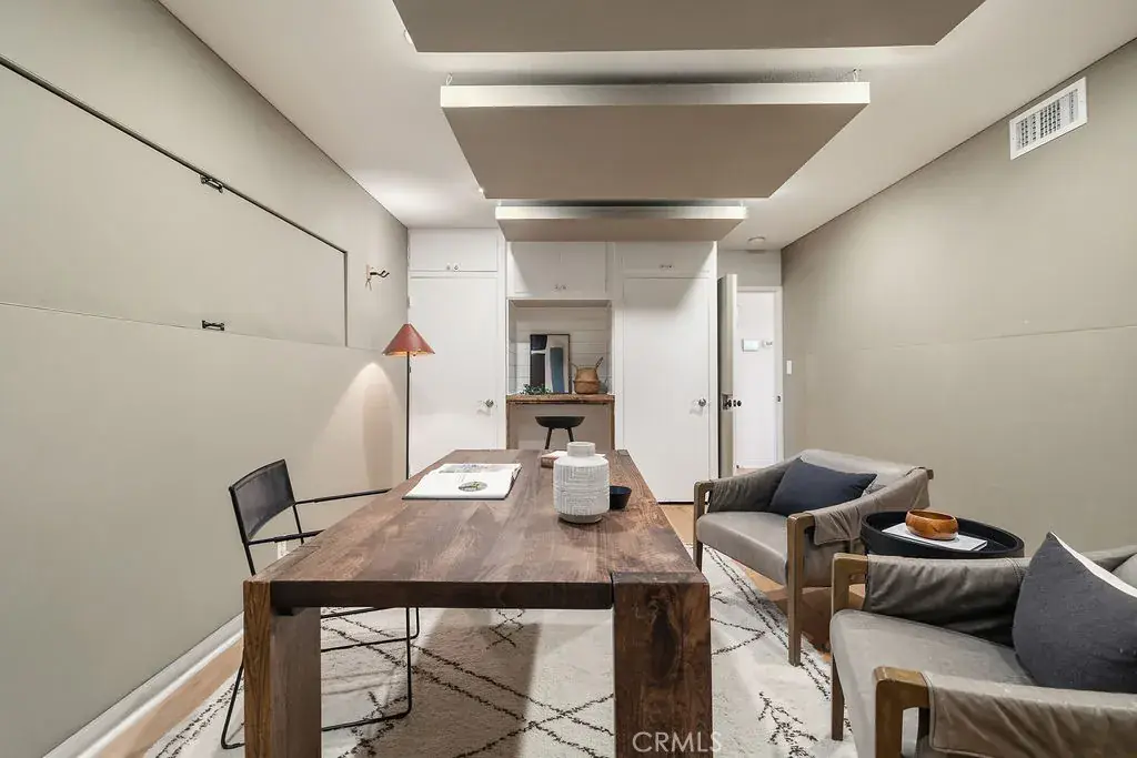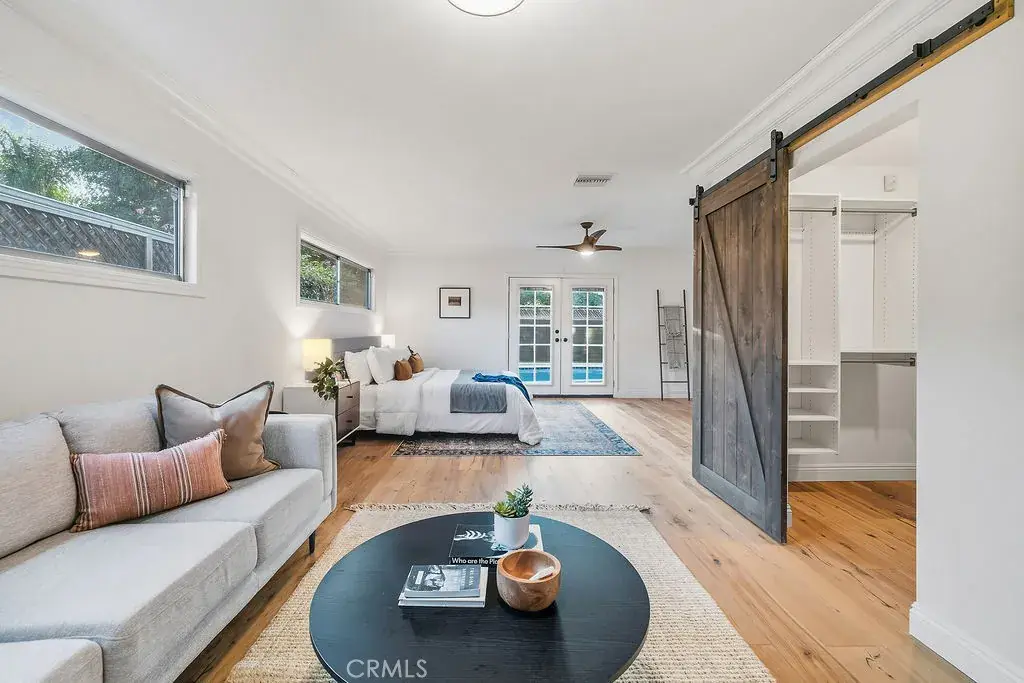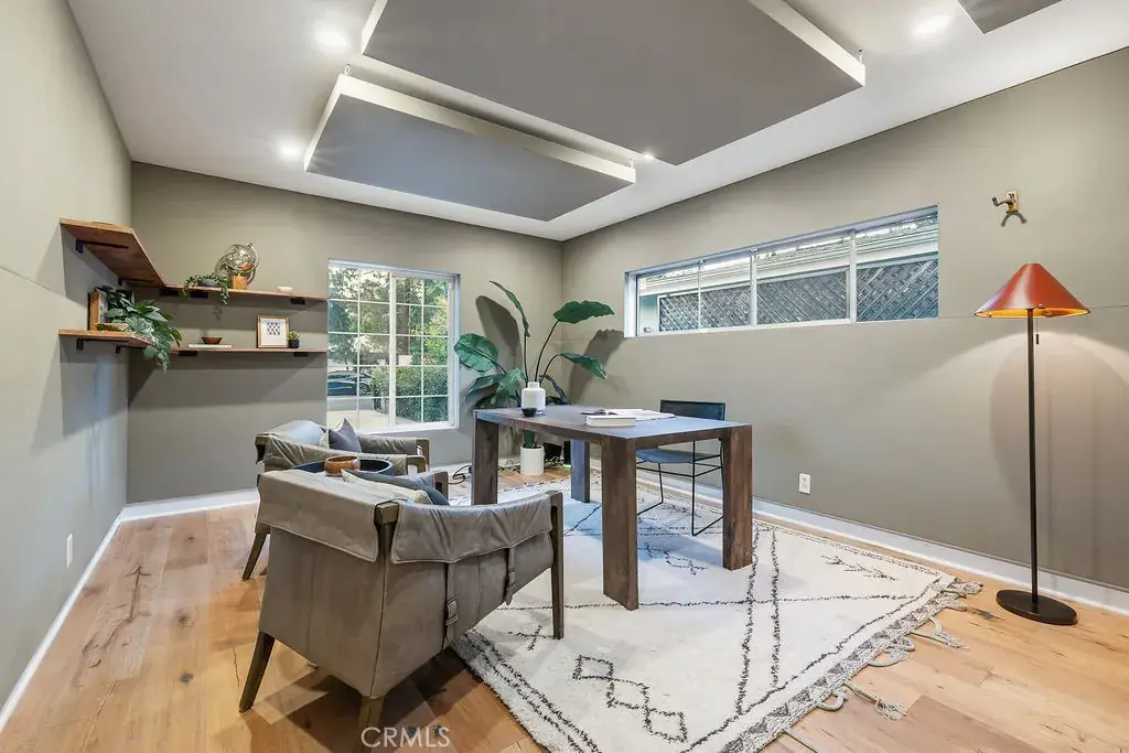 The primary suite boasts a spacious lounging area, walk-in closet, and access to the backyard. Two additional rooms and a full bath are located off the hallway. One bedroom includes the bonus of a custom professional-grade sound studio designed by Evolve Acoustics, ideal for podcasters, music producers, VO artists, or anyone seeking a quiet, creative retreat.
