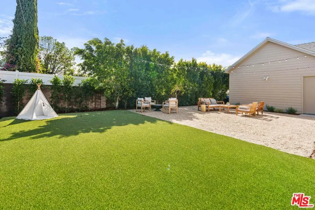 Welcome to this stunning one level new construction on a double cul-de-sac in Valley Village. A HUGE front door greets you past the Doorbird assisted gated entryway. The home has a traditional layout with a center hall that unveils each room as you pass. First off is the “Great Room” with 15 foot ceilings, wood beams, double sliding French Doors that open to a large entertainers yard, a stunning marble fireplace framed with bookshelves and storage. Across the hall you’ll find your guest powder room with custom “Taj Mahal” stone counters, Toto toilet and Newport Brass fixtures. Just past the powder is laundry and mud room. Now, off to the “Cooks Kitchen” with Thermador Appliances, Built-in French door fridge/freezer and drawer fridges in island, seating at the island for 4+ as well as a breakfast nook, coffee bar and a large walk in pantry. The dining room is adorned with custom paneling, moody paint choices, vaulted ceilings and access to the yard. Next, past the wall of custom storage cabinets are two ensuite bedrooms. Down the hall you’ll find the Primary Suite with an office, Vaulted ceilings with wood beams, hardwood floors, French Doors to the yard and the most attractive bathroom with Crema Marble flooring, counters, and surround on the sunken tub with Newport Brass fixtures, an exceptionally large shower shows off the custom Calcutta Marble tile and beautiful brass surround. Now, lets make our way outside. This 15k+ lot has one neighbor to the South and the rest of the massive yard is framed by rear yards. Privacy Galore. There is large pool and spa that was rebuilt with new eqpt, tile and plaster. The gazebo and built in BBQ overlook the wrap around yard that has multiple areas for a Sports Court or Pickleball, guest house or just running around. Enjoy the trees and the ancient Sycamore that the home was built around, truly special. A pleasure to view.