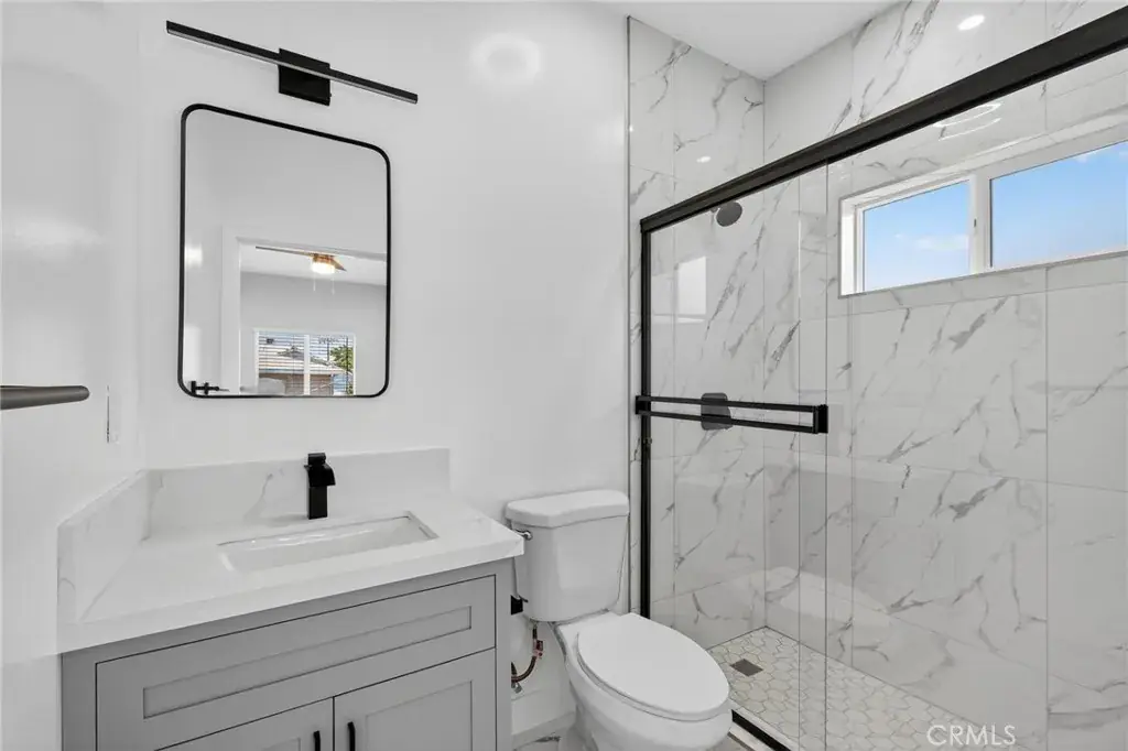 Beautifully remodeled two-bedroom, two bath upper unit in a great area of Van Nuys. The two bedrooms include one primary bed with a private bath and the second bedroom has direct access to the hall bath. Additional features include wood floors throughout, heating and air conditioning, new appliances included, private washer and dryer in the unit, double pane windows for comfort and quiet and one parking space.