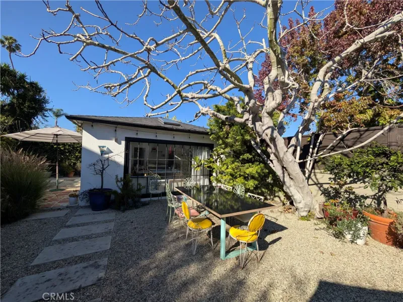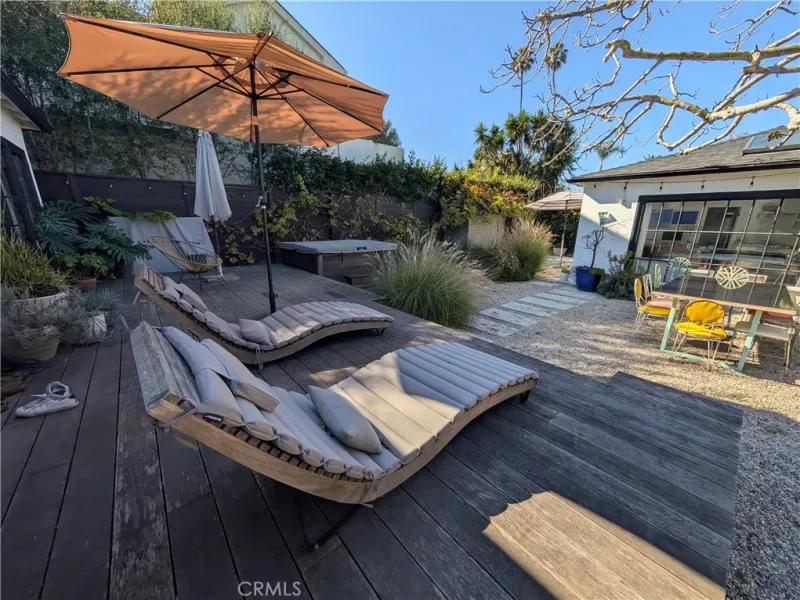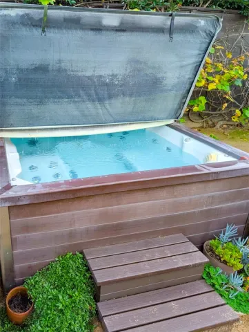 Charming and private backyard space features a private spa/hot tub and a mature fig tree.