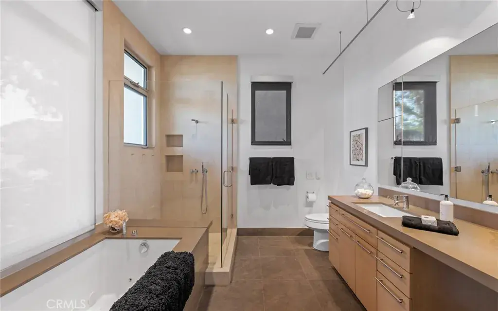 Step into a garden of peace in this Zen-like Venice beach home designed by Michael Allan Eldridge, AIA. One block from the beach on a famous walk street, totally gated and secure. Grand main entrance leads you to spacious living spaces, professional chef’s kitchen with the finest appliances, soaring ceilings and abundant natural light. The primary en suite master bedroom has 12 ft ceilings, walk-in closet and a sun drenched private balcony nestled in the tree tops. Take the floating staircase to any of the three en suite bedrooms or perfect work from home spaces. Rooftop patio with city/mountain views, perfect for entertaining and with a 53” BBQ and rotisserie, warming drawer, stovetop, ice maker, refrigerator, sink and purified water. 4 new HVACs for energy efficiency, Mecho solar shades throughout with security screens and cameras. Direct access to the 2 car garage with EV charging capabilities, industrial sink and storage. One block from the beach, Abbot Kinney… the “coolest street in America”, and the Venice Boardwalk… the most popular tourist destination in Los Angeles. (Photos are staged only; home is not furnished)