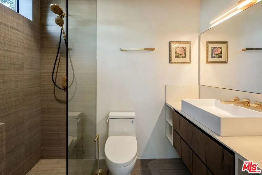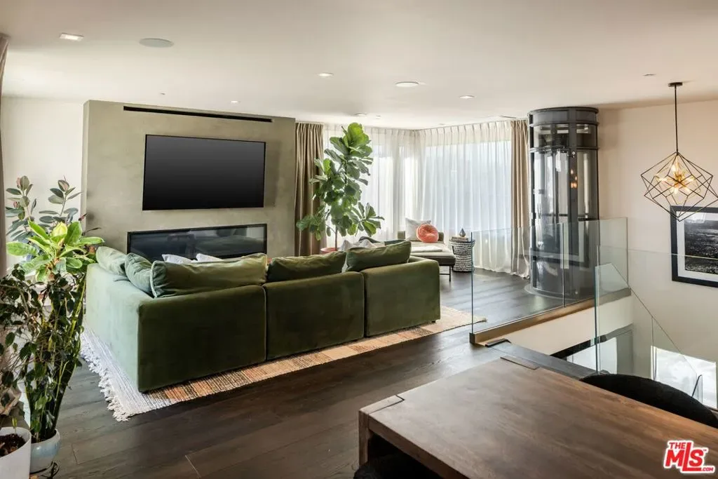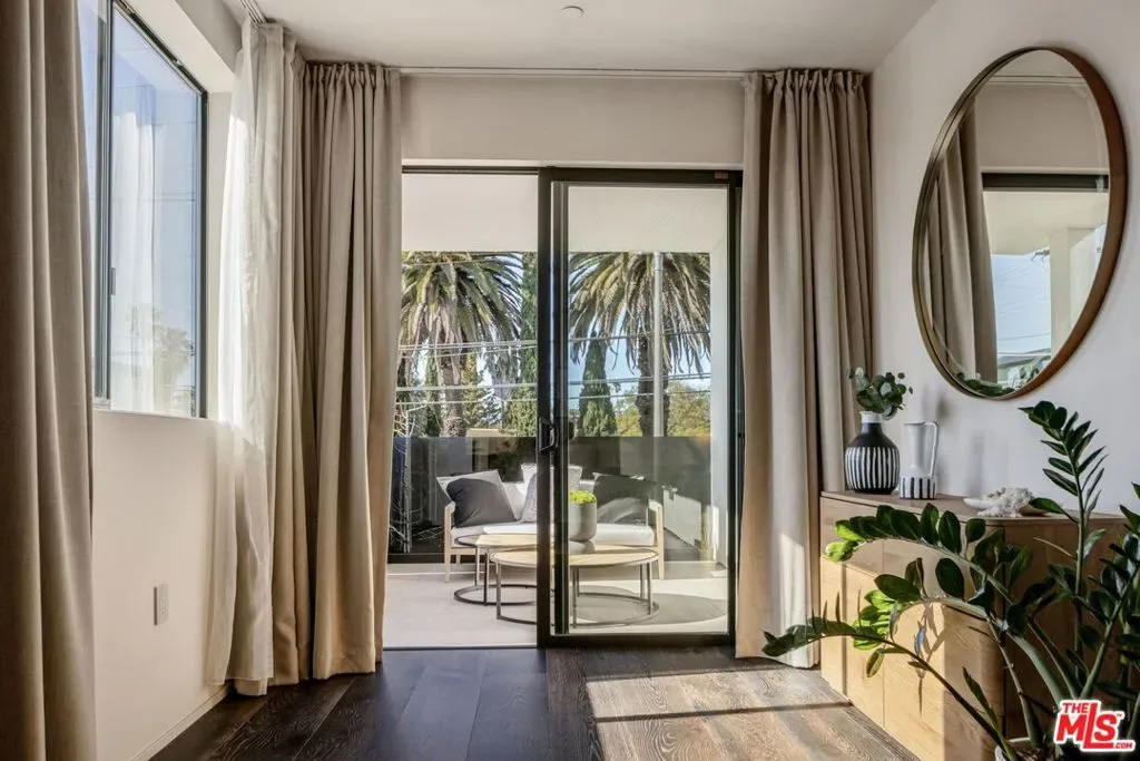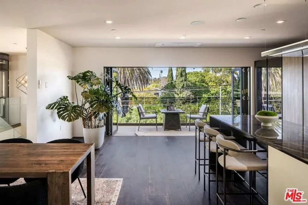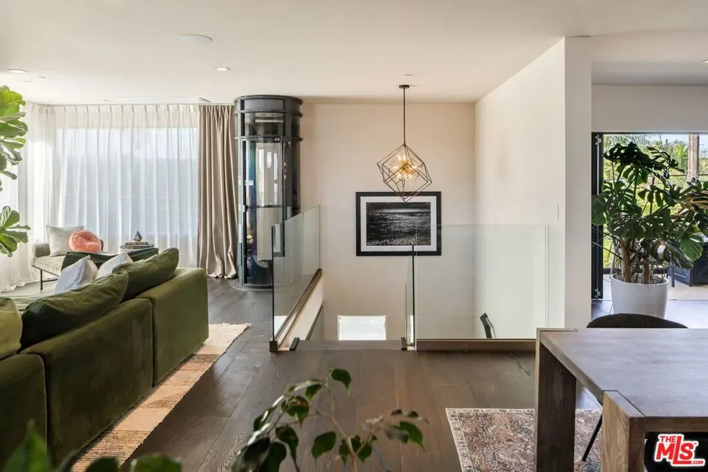 1208 Palms is designed for the way people want to live today, light-filled, open, and effortlessly connected to the outdoors. This contemporary architecture captures sweeping views of mountains and treetops while expansive windows bring sunlight into every corner. A striking floating staircase connects all three levels, complemented by a sleek capsule elevator that services each floor, combining sculptural design with everyday convenience. The top floor is the heart of the home, where the kitchen, dining, and living areas unfold in one expansive open space framed by walls of glass. The Italian-designed kitchen features Fisher & Paykel appliances, a Bosch dishwasher and microwave, custom shelving, a walk-in pantry, and a beautifully designed island made for gathering. Large sliding glass doors open to a generous outdoor deck, extending the living space into the fresh air. A built-in fireplace anchors the room, creating a warm focal point whether hosting friends or enjoying a quiet evening at home. Three of the four bedrooms are located on the second floor. The primary suite opens to a spacious private balcony and features a custom Italian-designed walk-in closet along with a spa-inspired bathroom with dual Italian vanities, a floating tub, and a porcelain shower. The additional bedrooms include custom Italian millwork closets and private en suite bathrooms, offering comfort and privacy for family or guests. On the first floor, the fourth bedroom offers flexibility as a guest suite, office, gym, or creative space. The entry level also includes a generous open area that flows directly to an outdoor patio, creating another inviting indoor-outdoor moment. The home is equipped with Savant Smart Home Automation with app-controlled lighting and AC, an integrated Sonos sound system, five Lorex security cameras, DoorBird entry, alarm system, prewired solar, and an installed EV charger. Custom California Closets are featured throughout, including the pantry. A two-car garage opens directly into the home. Ideally located at the corner of Palms and Penmar, you’re just a short walk to neighborhood cafes and boutiques, with a new corner bodega opening across the street. Easy, elevated livingjust add your throws, candles, and bikes.