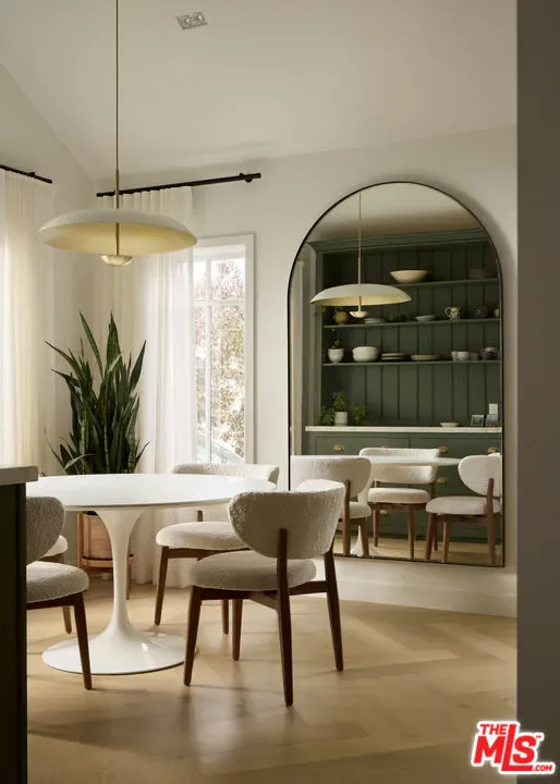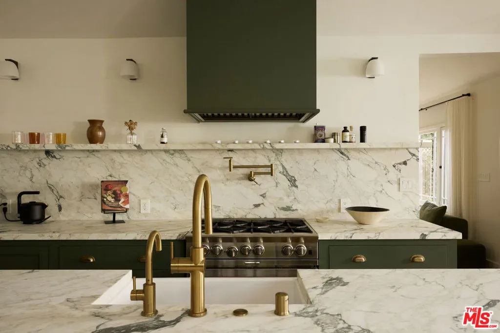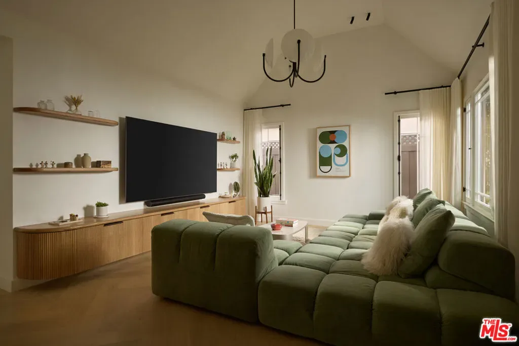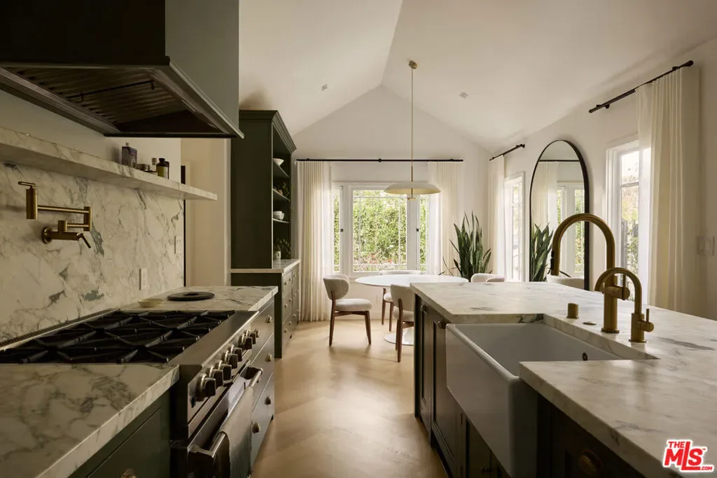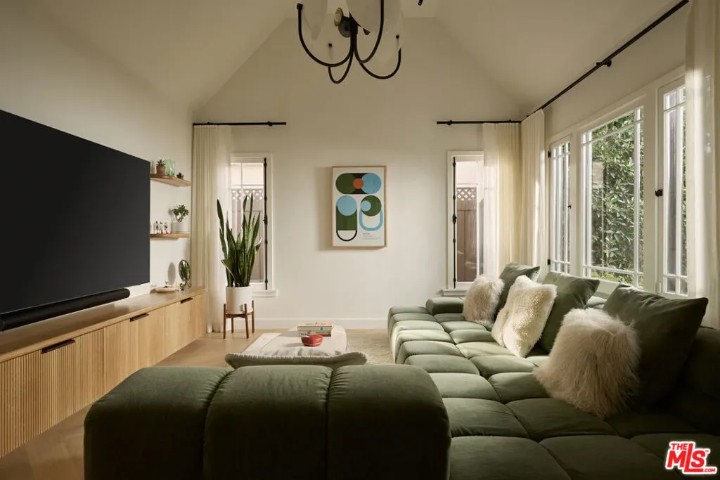 An extensively renovated, designer-done 2BD + 1BA home with detached studio, discreetly positioned behind gates and tall privacy hedging on a quiet Venice walk street. The main home has been completely reimagined, featuring vaulted ceilings, white oak chevron flooring, artisanal lighting, custom fluted millwork and built-ins throughout, and large picture windows that flood each room with natural light. The kitchen is a focal point, outfitted with honed marble countertops, chic olive integrated panel cabinetry, unlacquered brass Waterworks fixtures, and a full suite of Viking appliances. The layout offers an effortless connection between living, kitchen, and dining, with the detached guest house functioning as an ideal creative studio, WFH office, or bonus space. French doors lead to a cozy deck and a private courtyard with a fire pit and string-lit dining area beneath an olive tree. Situated on a 4,204 SF lot, this high-spec, turnkey home is moments from the beach, Abbot Kinney, and the best of Venice’s walk streets.