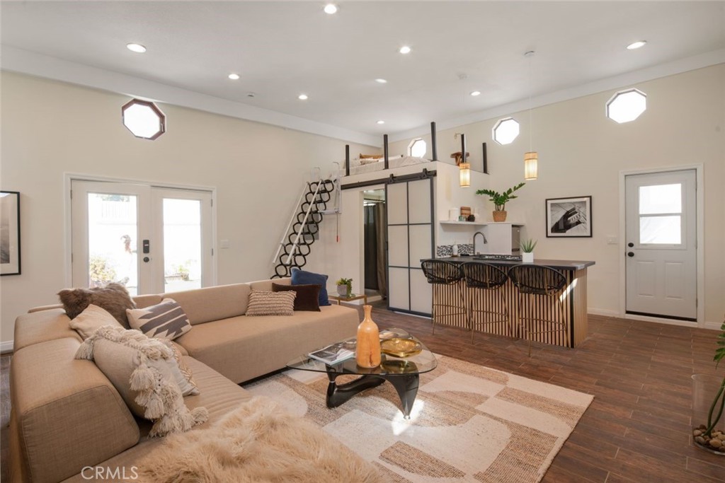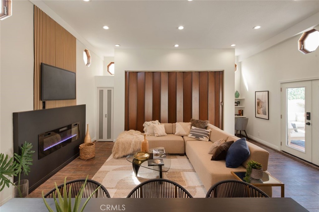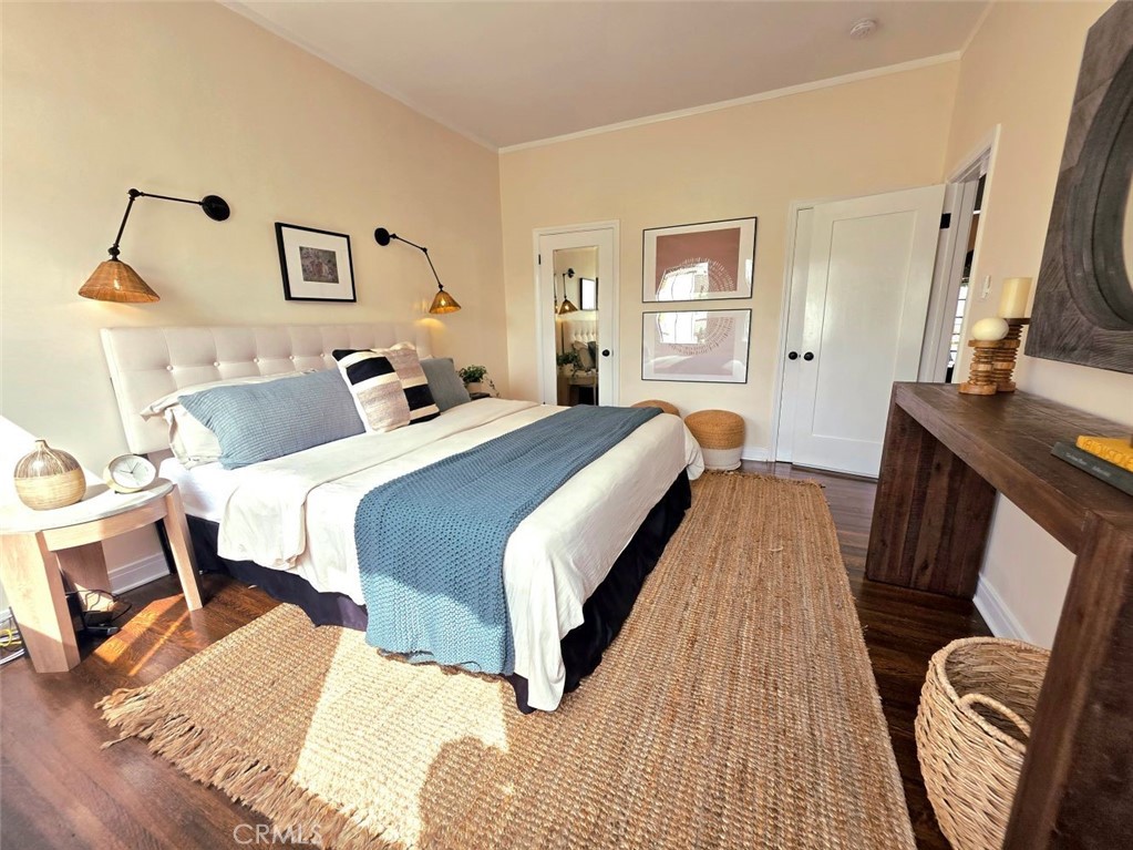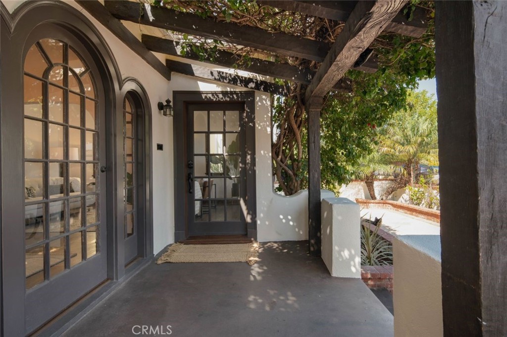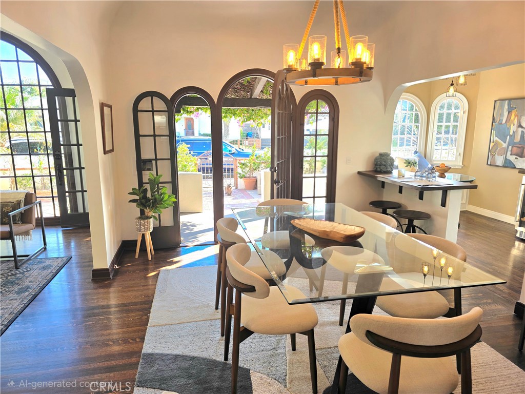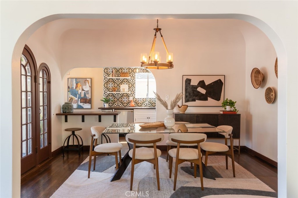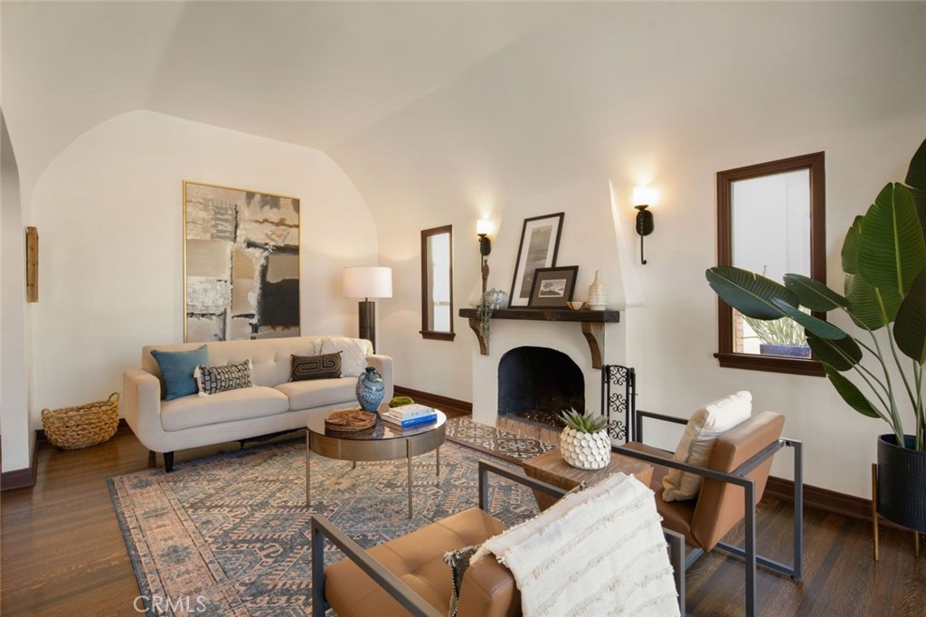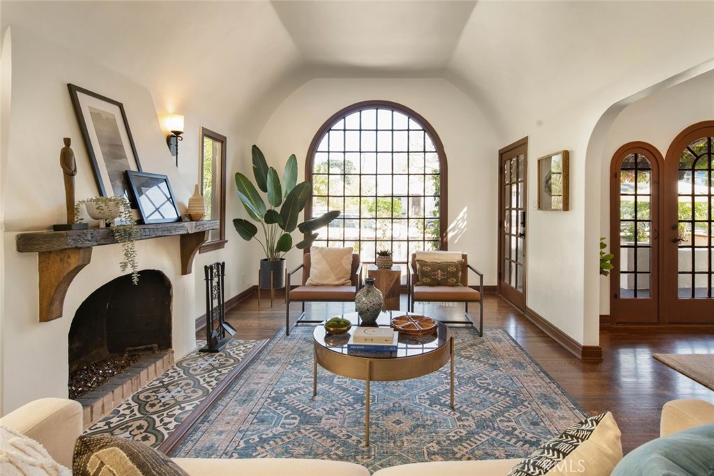 old-world architectural romance with the relaxed rhythm of coastal California living. Sunlight pours through a majestic 10ft arched picture window into soaring coved ceilings, illuminating the rich espresso hardwood floors. Classic Spanish architecture unfolds