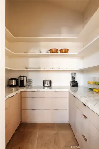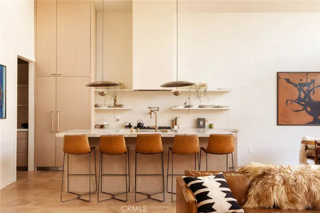 The Main House: Defined by soaring cathedral ceilings, skylights, and custom Tadelakt plaster finishes, the single-story layout is flooded with natural light. The chef’s kitchen is anchored by built-in Thermador appliances and a walk-in pantry, there is a dedicated movie room and a wet bar. The primary suite serves as a quiet retreat with a spa-inspired bath and generous walk-in closet.