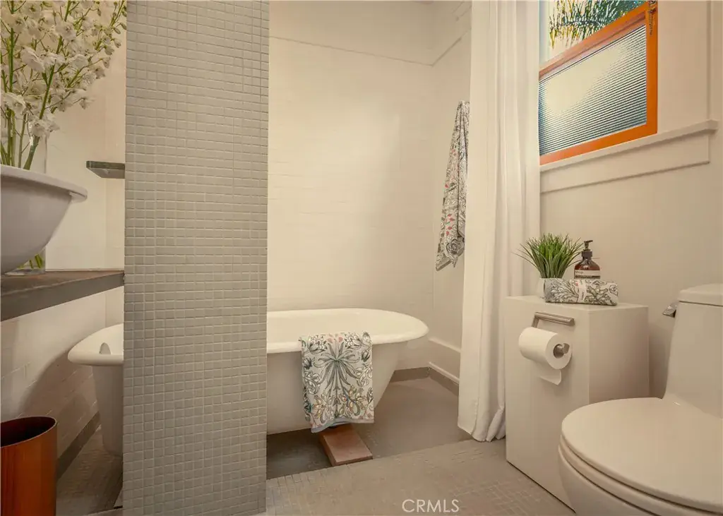 This two-bedroom, two-bath retreat offers a quiet, calming atmosphere with abundant natural light and views of surrounding greenery. The downstairs bedroom—currently used as a living and music space—features a sliding pocket door that preserves vintage character while offering flexibility and privacy. The upstairs suite includes heated flooring and a radiant-heated balcony.