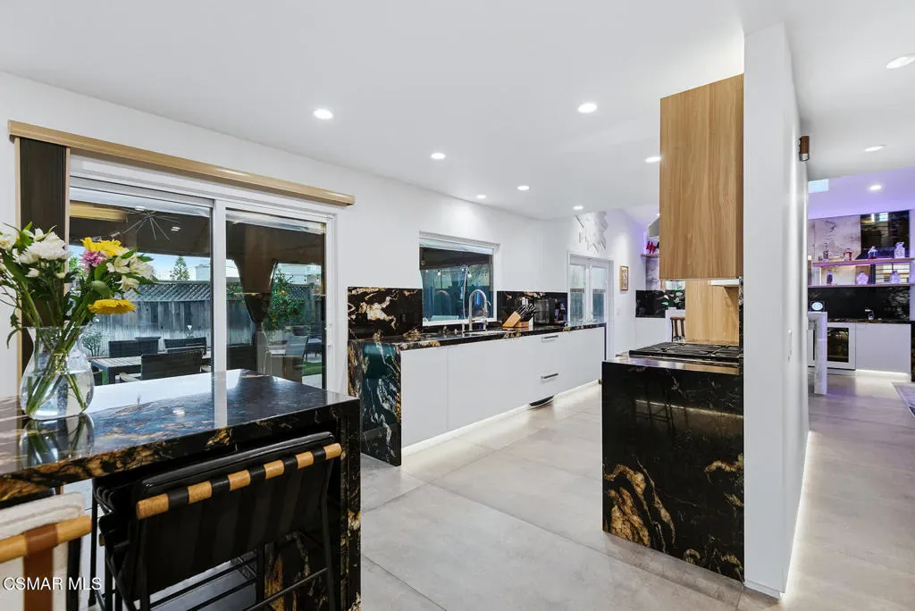 Welcome to a truly one-of-a-kind modern home in the heart of Ventura, where thoughtful design, high-end finishes, and effortless entertaining come together beautifully. Located at 9998 Jamestown, this exceptional residence blends contemporary luxury with everyday comfort in a desirable, established neighborhood. From the sleek smooth-stucco exterior and metal roof to the landscaped front yard with synthetic turf, low-voltage lighting, and a serene Buddha water feature, every detail has been carefully curated to create a striking first impression. Inside, the open great room impresses with large-format concrete tile floors, skylights that flood the space with natural light, base lighting, a dramatic custom onyx fireplace, and a built-in Dolby Atmos sound system. French doors with built-in shades and blackout blinds create a seamless indoor-outdoor flow and a comfortable, modern ambiance. The gourmet kitchen is both stylish and functional, featuring custom two-tone cabinetry, a Wolf range, built-in JennAir refrigerator, Fisher & Paykel drawer dishwasher, microwave drawer, and striking Golden Spectrolite granite countertops with waterfall edges. An extended dining area with wraparound cabinetry and built-in storage adds to the home’s effortless entertaining appeal. A custom bar elevates the space even further, offering a Sub-Zero mini fridge, Viking ice maker, onyx bar top, and ambient accent lighting, perfect for hosting or unwinding at the end of the day. The primary suite is a private retreat with real wood floors, a smoked mirror feature wall, and a spa-inspired bathroom complete with marble countertops, a Toto toilet, zero-threshold drains, custom glass enclosures, and a luxurious steam shower.Step outside to a backyard designed for memorable gatherings, featuring synthetic turf, citrus trees, low-voltage lighting, and a pergola with curtains and soft lighting for relaxed evenings under the stars. The garage is a true bonus space with showroom-style epoxy floors, custom cabinetry, a mini-split system, built-in speakers, a washer and dryer, and premium lighting, ideal for a home gym, studio, or ultimate hangout zone. With smart features, upgraded electrical, a tankless water heater, soft-water system, Milgard windows and doors, and a glass garage door, this exceptional home at 9998 Jamestown, Ventura, CA delivers modern luxury, comfort, and turnkey living at its finest.
