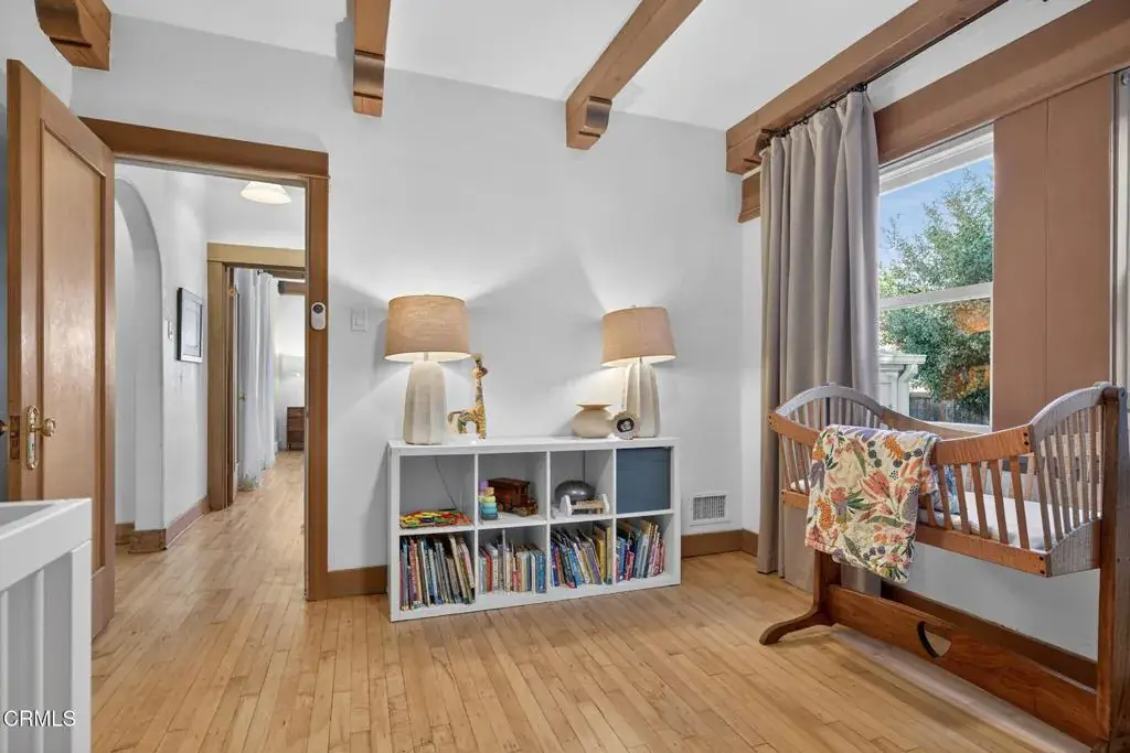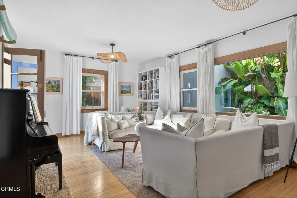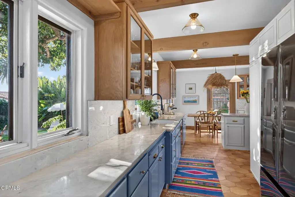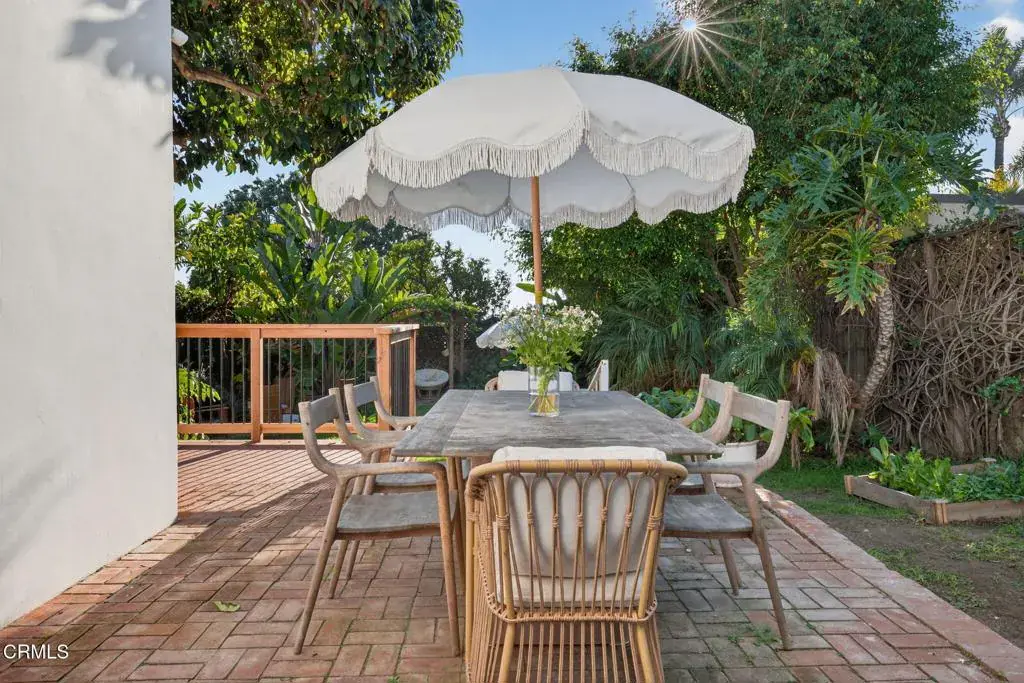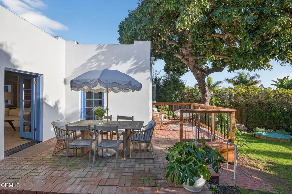 Tucked into the highly desirable Hobson Heights neighborhood, Casa Azul is a 2 bed, 2 bath Mediterranean cottage from the 1920s with authentic character that unfolds slowly and stays with you. Behind the Picasso blue gate, a quiet front courtyard wrapped in birds of paradise and scented by citrus immediately softens the world outside. It is peaceful here, private, and a true buffer from the street. Step through the arched original front door into a bright, welcoming living room filled with natural light. Original wood floors, graceful arches, and beautifully washed wood trim give the space warmth and character, the kind of room you want to sit down in and stay awhile. Santa Barbara style plaster walls, wood beam details, and hand selected Moroccan inspired lighting create a collected, personal feel layered over time rather than designed all at once. The kitchen is both beautiful and functional, finished with Carrara marble countertops, a marble tiled architectural niche, generous pantry, and a bay window overlooking the garden. Doors open directly to a south facing outdoor dining deck, extending everyday living outdoors. A wraparound deck leads to a private backyard with an established avocado tree, gas fire pit, grassy entertaining area, raised veggie boxes, and multiple seating spaces for gatherings, quiet mornings, or sunset evenings. A peek a boo ocean view through the trees is a reminder of how close the beach truly is. Both bedrooms feel like serene sanctuaries featuring walk in closets and wood beam ceilings. The primary bathroom is especially unique with a vaulted Moroccan inspired ceiling and skylight. A separate lower level bonus room with its own entrance offers flexibility as a home office, art studio, or guest space. Updates include a new Mitsubishi heat pump HVAC system installed in 2024, refinished hardwood floors, updated electrical panel that is solar ready, and new outlets and GFCIs. A permeable pea gravel drive provides parking for multiple vehicles along with a one car garage. Previously approved plans for an attached second story ocean view JADU with permits lapsed in 2025 offer future potential. Despite its central midtown location, Casa Azul feels like a quiet oasis moments from parks, shops, downtown, and the ocean, a home with character and soul you feel the moment you walk through the blue gate.