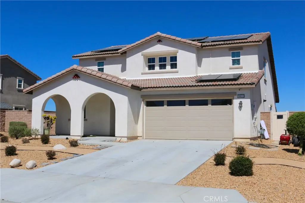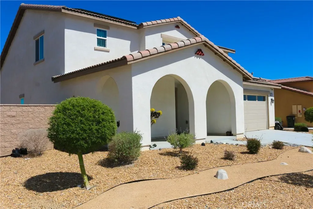 Spacious 4-bedroom, 3-bathroom two-story home in Victorville, located within the highly sought-after Snowline Joint Unified School District. This home features a functional and hard-to-find layout with a primary suite downstairs, plus an additional bedroom and full bath—ideal for multi-generational living, guests, or flexible use. Upstairs offers three additional bedrooms along with a versatile loft, perfect for a second living space, home office, or playroom. The open-concept kitchen and living area offers ample cabinetry, generous counter space, and abundant natural light—creating a comfortable space for both everyday living and entertaining. Built in 2020 by D.R. Horton, this newer construction includes modern design, central HVAC, and an attached 2-car garage. A solar system is already in place with a hybrid setup (partially paid off and partially leased), offering potential energy savings. The exterior features low-maintenance desert landscaping, a welcoming covered entry, and a clean, well-kept streetscape that enhances curb appeal.