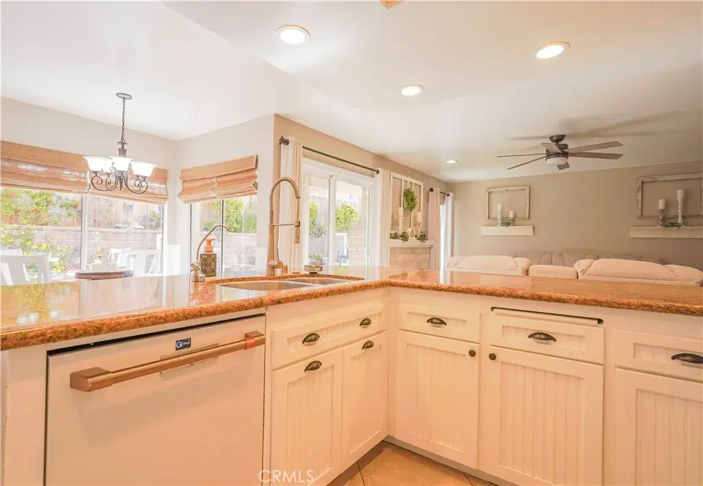 The open-concept kitchen is designed for both style and function, featuring granite and quartz countertops, under-cabinet lighting, a breakfast nook, and quality cabinetry. The adjoining dining area includes a decorative candelabra-style light fixture, and a evaporative cooler located near the dining area helps efficiently cool on those hot days, when you don’t want to run your A/C.
