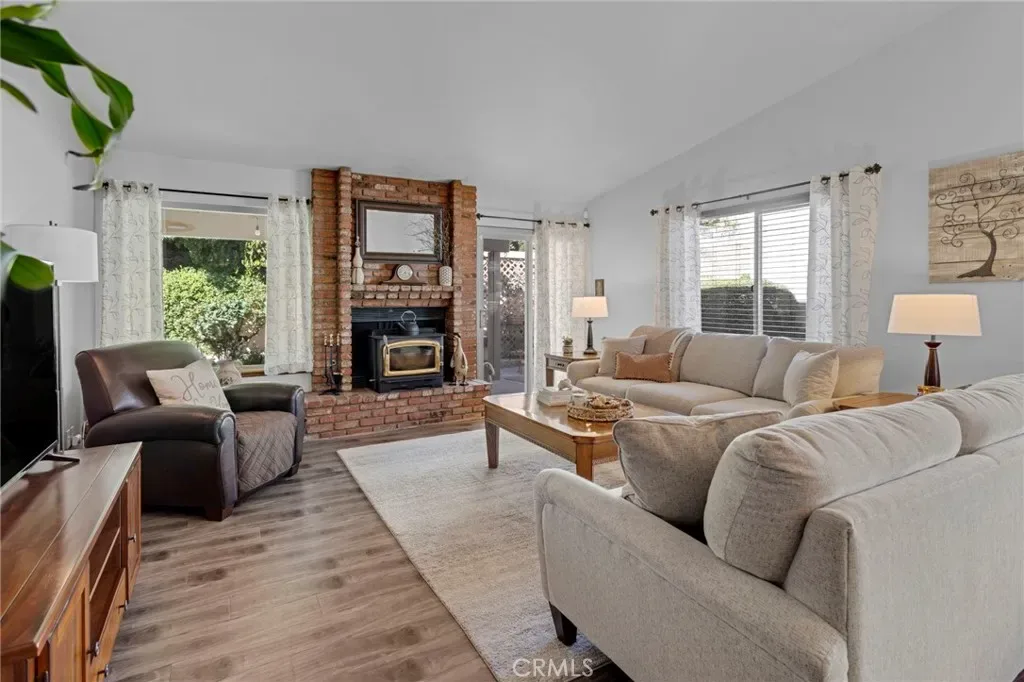 Step inside to a warm and inviting great room featuring a cozy wood-burning stove fireplace, perfect for relaxing evenings. The home boasts vaulted ceilings, abundant natural light, and beautiful wood accents throughout, creating a unique and welcoming atmosphere.