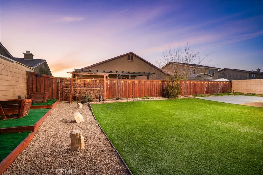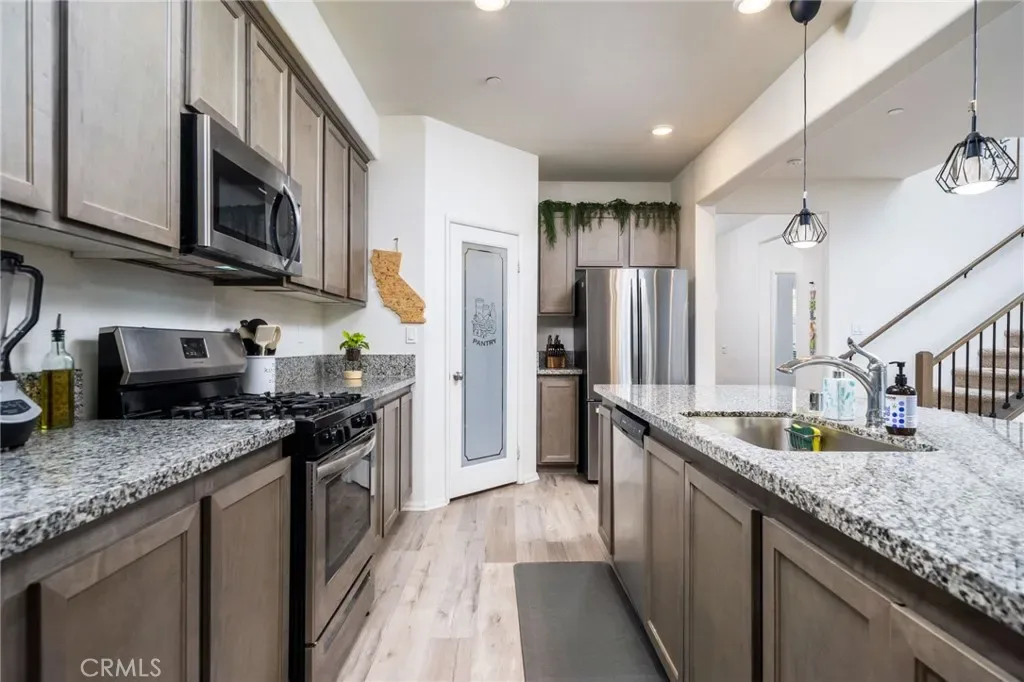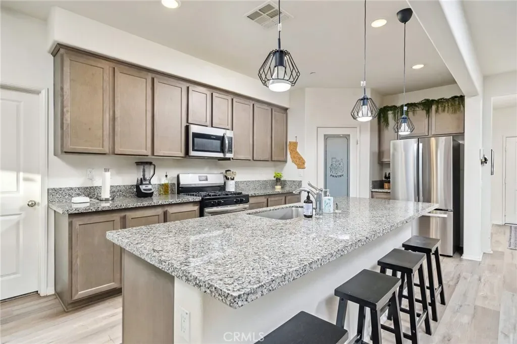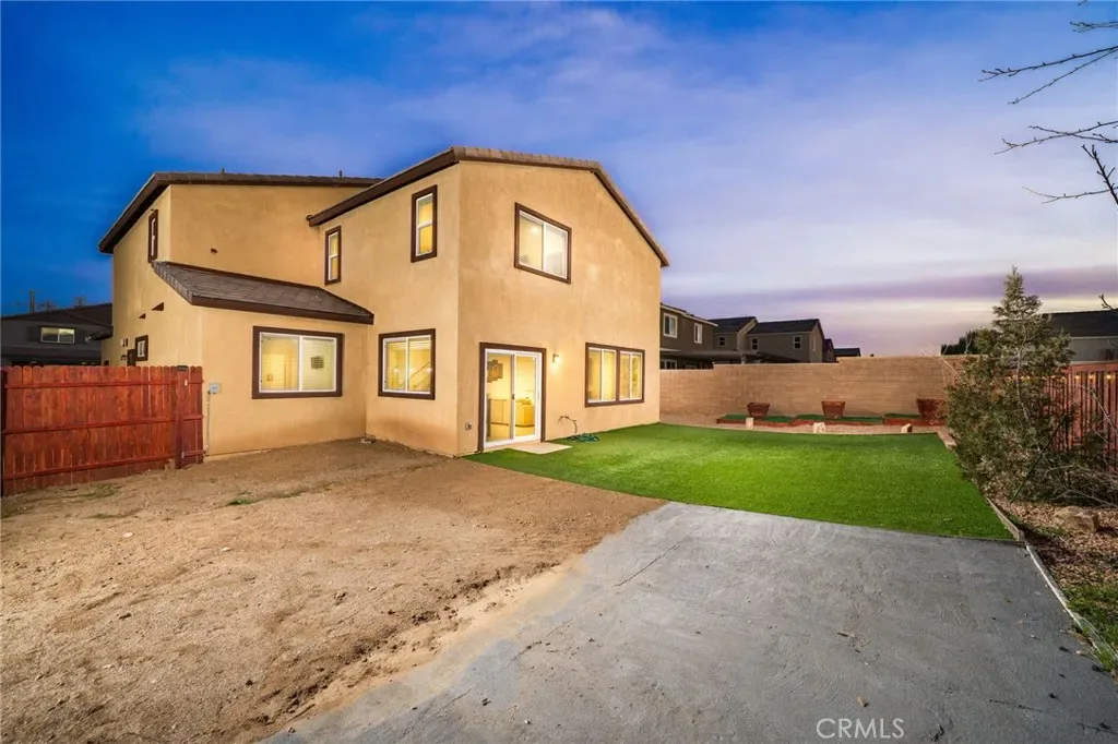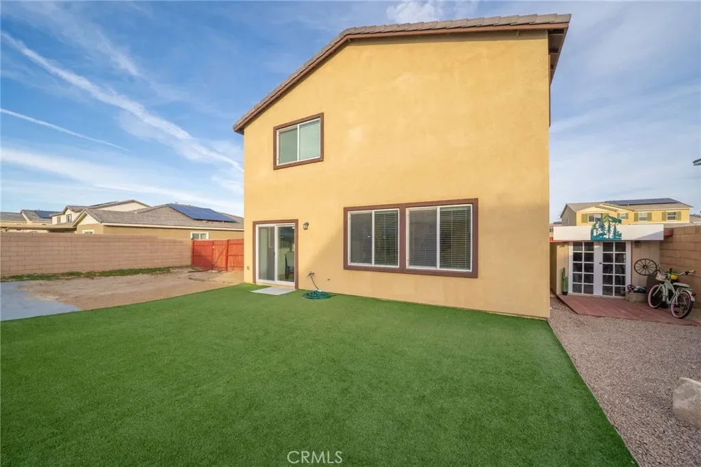 TURN KEY MULTI GENERATIONAL HOME WITH SOLAR IN DIAMOND RIDGE. Built in 2020 by Frontier Homes, this spacious and thoughtfully designed single-family residence offers a blend of modern comfort, functionality, and location. Featuring 5 bedrooms, 4 bathrooms, and approximately 2,915 square feet on a 7,300 square foot lot, this home provides ample room for everyday living and entertaining. A large open-concept great room welcomes you upon entry, seamlessly connecting the kitchen, dining, and living areas. Filled with natural light, this space feels open and inviting. The kitchen features granite countertops, a walk-in pantry, and pendant lighting over a generous island—ideal for meal prep or casual dining. The adjacent dining area makes hosting easy and convenient. Wide plank laminate wood flooring runs throughout the main living areas, offering both style and durability. The home also includes over $11,000 in builder upgrades, including flooring and window coverings. The versatile floorplan includes two downstairs bedrooms—one with an en-suite bathroom—ideal for guests or in-law living. Upstairs, a spacious loft offers flexibility for a media room, workspace, or additional living area. The primary suite features a large walk-in closet and an en-suite bathroom with dual vanities, a separate tub, and shower. Two additional bedrooms and an upstairs laundry room complete the upper level. The backyard is designed for both enjoyment and low maintenance, featuring artificial turf, a large storage shed, and a variety of fruit trees including grapes, pears, figs, peaches, apples, plums, and watermelon. Additional highlights include a two-car attached garage, extended driveway for extra parking, and NO HOA. A solar system at $157 per month helps keep electricity costs low. Ideally located less than one mile from Vista Verde Elementary, under two miles from Silverado High School, and one mile from Mesa Linda Park. Adelanto Marketplace—featuring Stater Bros., Starbucks, Walmart, and more—is just 1.5 miles away.