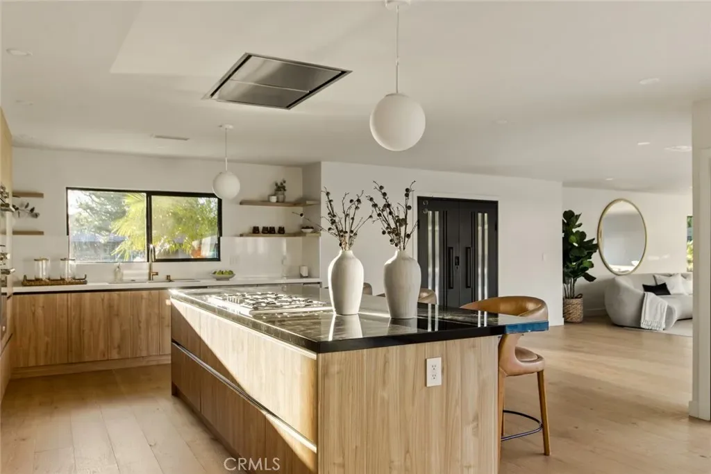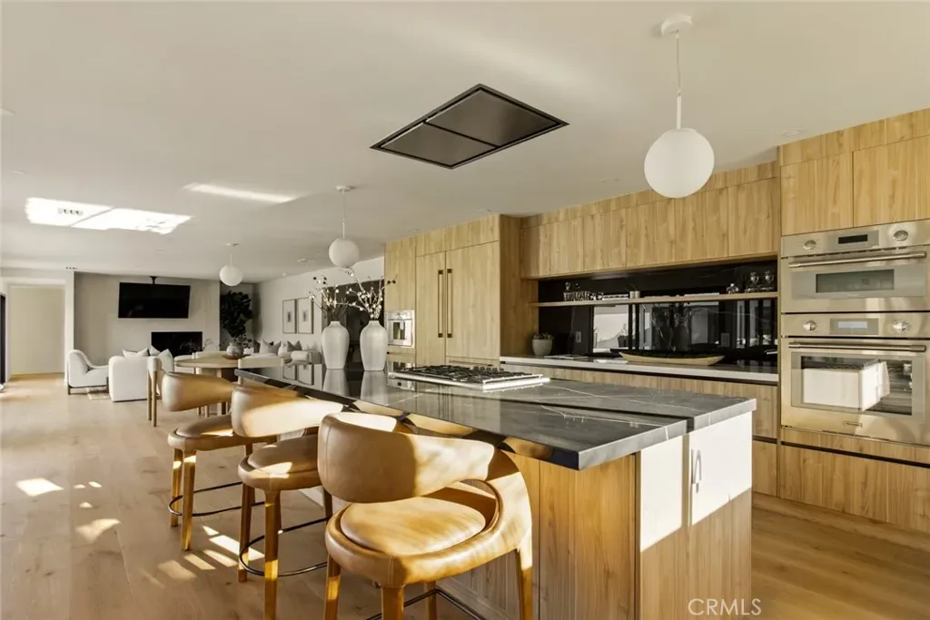 The kitchen features custom cabinetry, Italian porcelain and quartz countertops, premium Sub-Zero and Thermador appliances, dual dishwashers, and a built-in coffee station. Walker Zanger tile accents the space, while the butler’s pantry includes a steam oven and wine refrigerator.