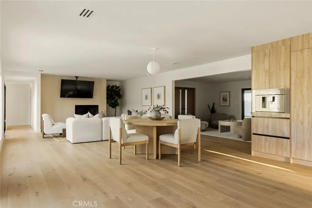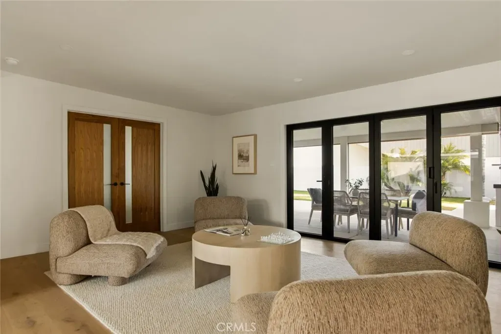 Wide-plank European oak flooring complements expansive glass walls, including multiple multi-slide doors, a dramatic 14-foot bifold opening to the courtyard, and additional bifold doors to the backyard.
