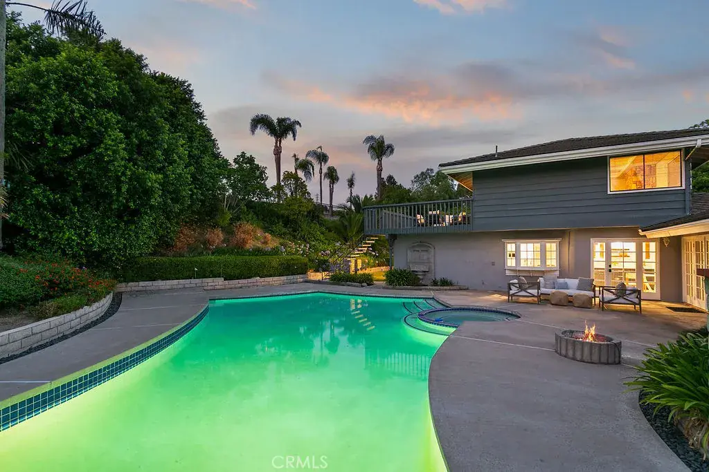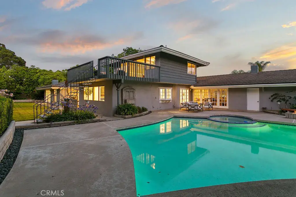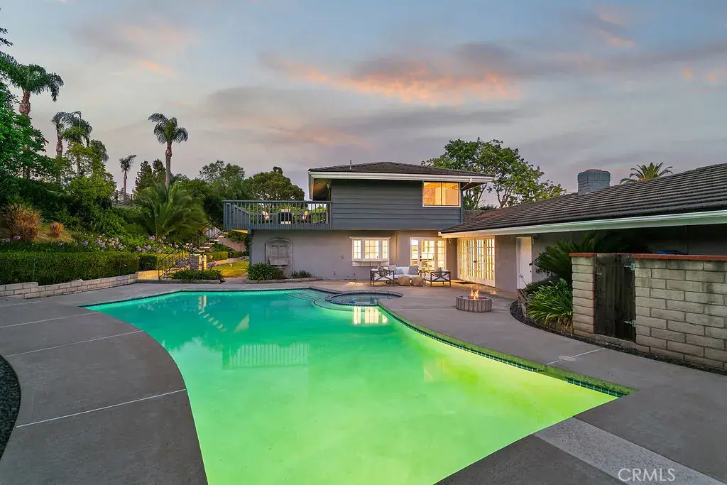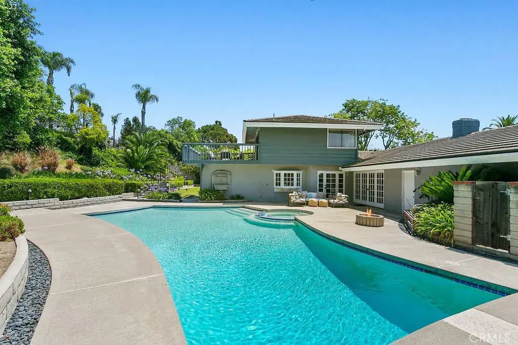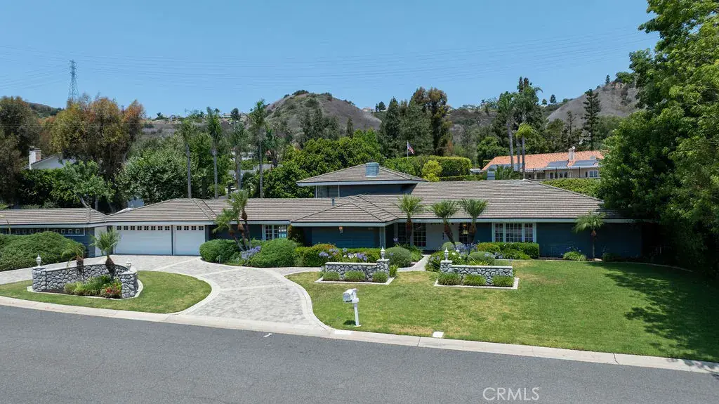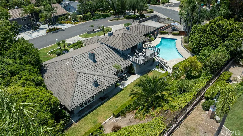 Your luxury dream has arrived with this sprawling Villa Park estate. Tucked away in the private rolling hills of Villa Park, this home has the perfect blend of traditional feel and modern utility. Situated on an expansive half-acre lot and featuring river rock hardscape, lush landscaping, and a circular driveway, the property offers stunning curb appeal and an unforgettable first impression. Step through custom, side-lit double doors into a light-filled and functional entryway. Soaring cathedral ceilings, trendy hardwood floors, and an expansive living room view set the tone immediately. The living room has an impressive custom finished fireplace framed with built in shelving and hutches on either side. French Doors along the back give this entry experience a light and airy feel. Kitchen is a culinary dream with moveable butcher island, custom two-tone cabinets, quartz counters, farm sink, walk in pantry, SS appliance package, and views of the sparkling pool. The kitchen also boasts a custom-built in hutch with glass inlaid uppers, and plenty of room for a kitchen nook table. Family room is once again, spacious and cozy with cathedral exposed beam ceiling details, white block finished fireplace, wainscotting, built in wet bar, hardwood floors and French door wall with views of the sparkling pool and spacious backyard. The primary bedroom is open and inviting with brick finished fireplace, French door wall, and access to a resort like primary bath. The primary bath is complete with spacious walk-in closet, custom cabinets, dual vanity, cosmetics counter, floating shelves, walk in shower, and bath yard access for after swim washes. Secondary baths have been finely appointed with custom cabinetry, massive soaking tub, elegant hardware and faucets finishes, and dual vanity sink in hall. This home lives like a true single story with all living area on the main level. It does enjoy a second story bonus room with a private balcony and stone finished fireplace. The dining room is such a treat with elegant ceiling detail, rear location for privacy, and oversized windows for plenty of light and scenic exterior views. The backyard is your own peaceful retreat complete with lush, manicured landscape slope, sparkling pool, raised deck, firepit, and quiet tranquil atmosphere. Other features include ceiling fans, spacious 3 car garage, huge attached and covered storage area, cathedral ceilings in common areas, idyllic quiet location, spacious laundry, and so much more!