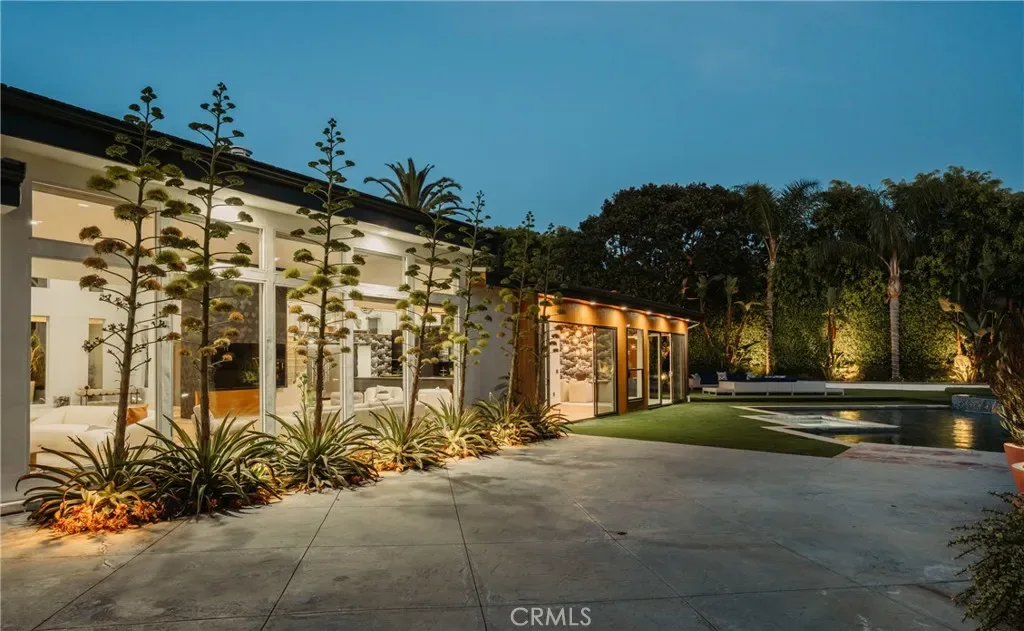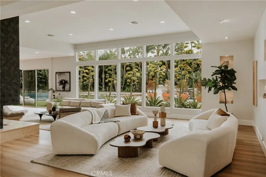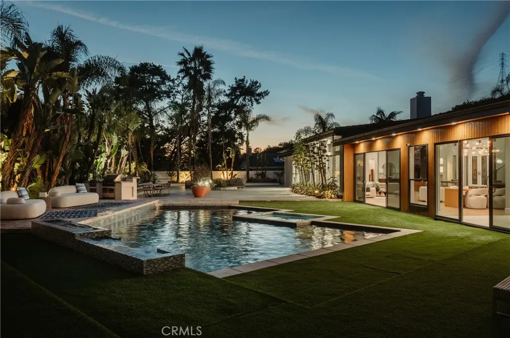 Large spans of glass and generous ceiling height fill the main living areas with natural light and create an open, welcoming atmosphere without sacrificing warmth. The spaces transition naturally outdoors to a wide, flat backyard, uncommon for the area, designed for both quiet daily use and large gatherings. Mature landscaping, newer drought-tolerant plantings, new turf throughout the yard, and a renovated pebble-tech pool and spa create a private setting that feels relaxed yet expansive.