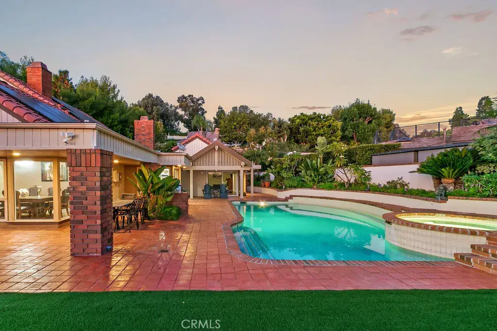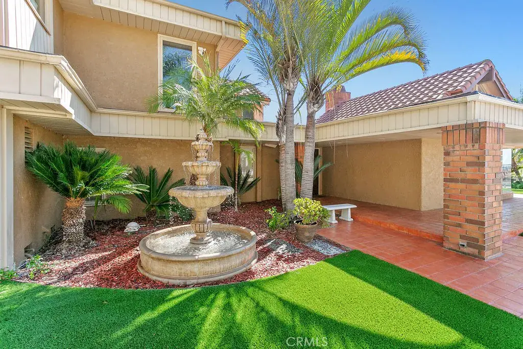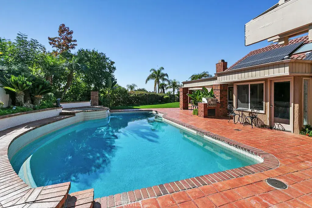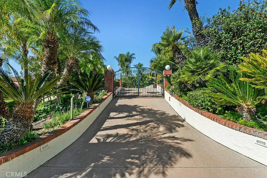 This serene and tranquil Villa Park lux estate enjoys one of the most unique and exclusive locations available on the market today. Tucked away in Villa Parks rolling hills, this expansive 5362 square foot gem boasts a true cul-de-sac location, complete with gated entry. The mix of mid-century modern style and extremely private location gives this estate a feeling reminiscent of the historic Hollywood Hills. Enter through the automated privacy gate into lush grounds with mature landscape, drought tolerant turf and ample on-site parking. Glass inlaid double doors give way to a spacious and inviting entry. Travertine floors, floor to ceiling windows, and crisp architectural lines set the tone for this elegantly finished estate. The living room boasts soaring ceilings, corner fireplace, custom base, and clear pane elevated windows for lots of natural light. The dining room is spacious and expertly located between the kitchen and formal living room. With plenty of room for a 10-person dining set, this dining room is perfect for quiet family nights or those busy holiday events. The kitchen is for the culinary enthusiast, complete with high end Thermador appliances, Sub Zero Fridge, double ovens, 6 burner gas range w/ hood, granite counters, stain grade custom cabinets, and an open ceiling concept. The family room is open and kitchen adjacent giving a great room concept feel and lends itself perfectly to family gatherings and entertainment. The primary bedroom feels open and awash with light due to the cathedral ceilings and corner window set complete with views of the beautiful backyard. The primary bath is finished with wrap-around dual vanity, large soaking tub, skylight, and elegant lead glass picture window for added natural light. Upstairs one finds an incredible bonus room with huge square footage, elegant wood grain built in bar, soaring ceilings, and finely appointed second primary suite. The backyard is peaceful and serene, with tranquil Koi pond, resort like pool and elevated spa, wrap-around patio/loggia, built in BBQ, and private ambiance. Other exciting features include whole house fan, 3 separate HVAC units, fully finished garage with EV charging port, PAID for 39 panel 13.65 KW solar system, mature fruit trees, 4-bedroom PLUS office and private gym, 3 full baths and 2 half baths, skylights, and so much more. Call immediately for additional details.