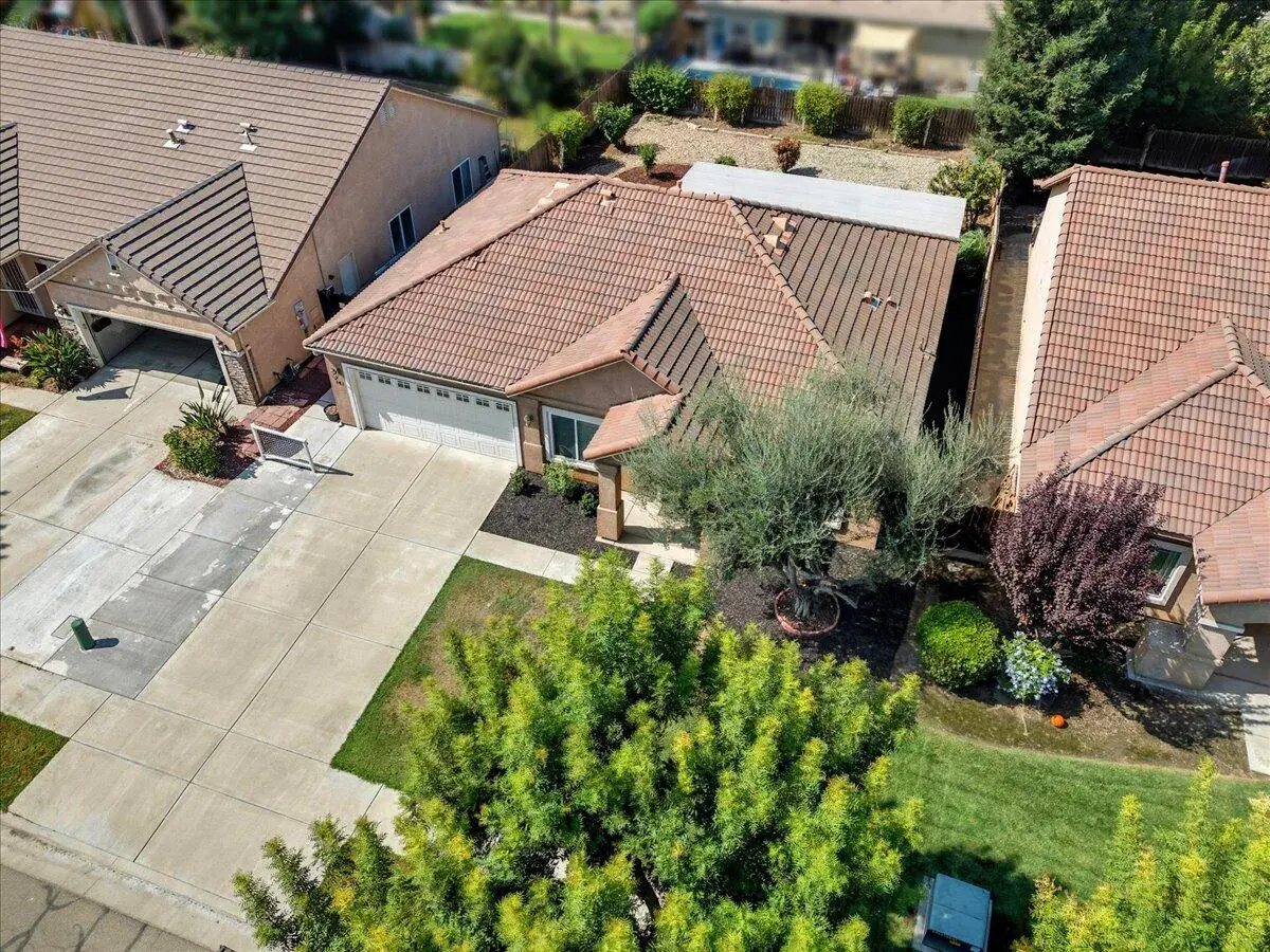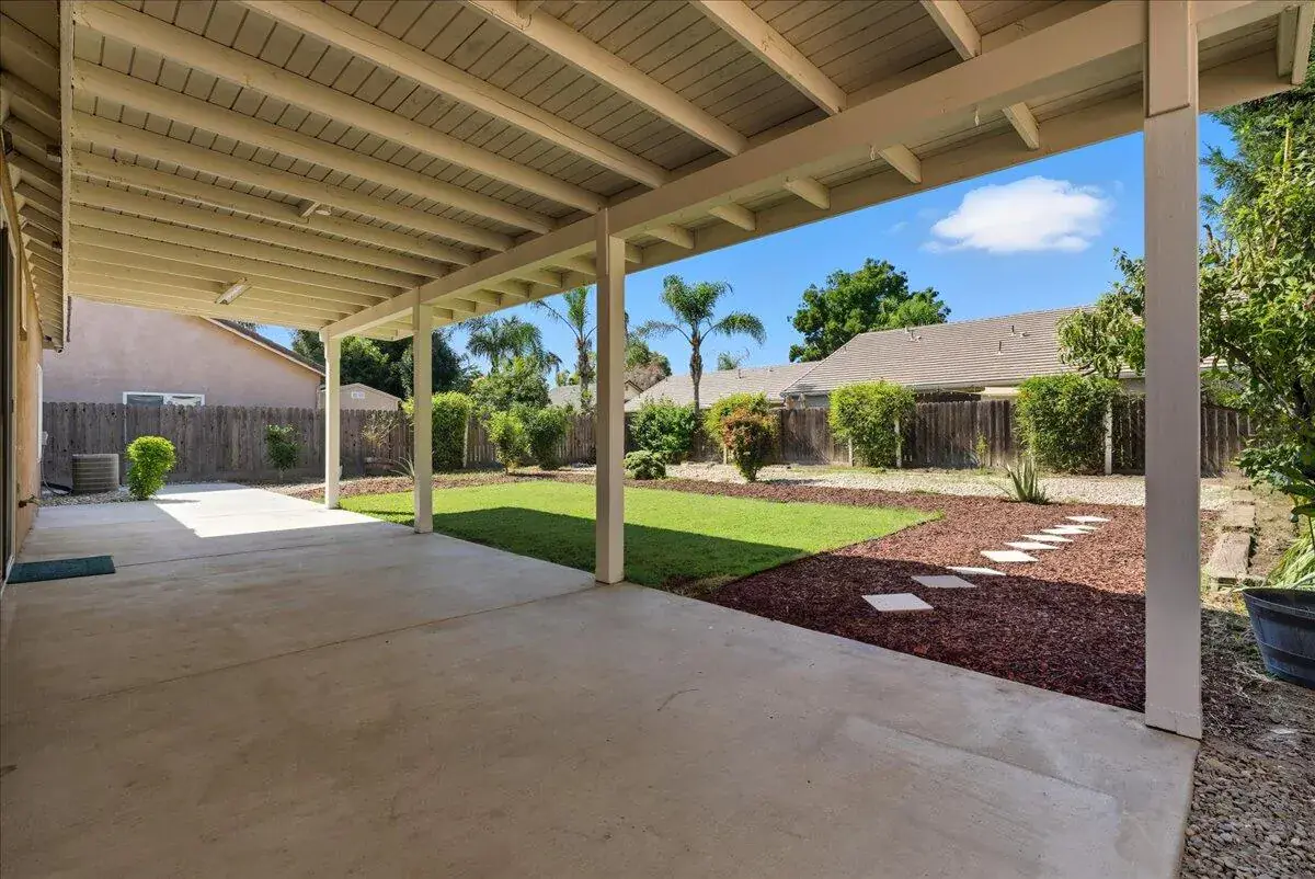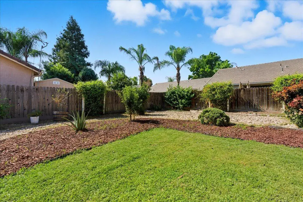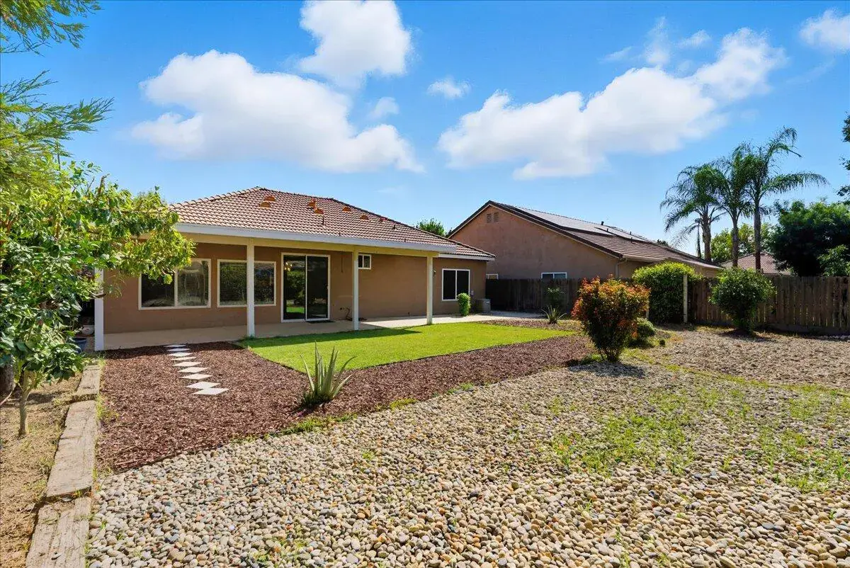 The spacious primary suite is a true retreat with a large walk-in closet, sunken tub, and dual sinks. Outdoors, enjoy a newly landscaped backyard complete with peach, lemon, and almond trees, plus automatic sprinklers with a new timer box for easy maintenance. The finished garage offers built-in shelving for extra storage.
